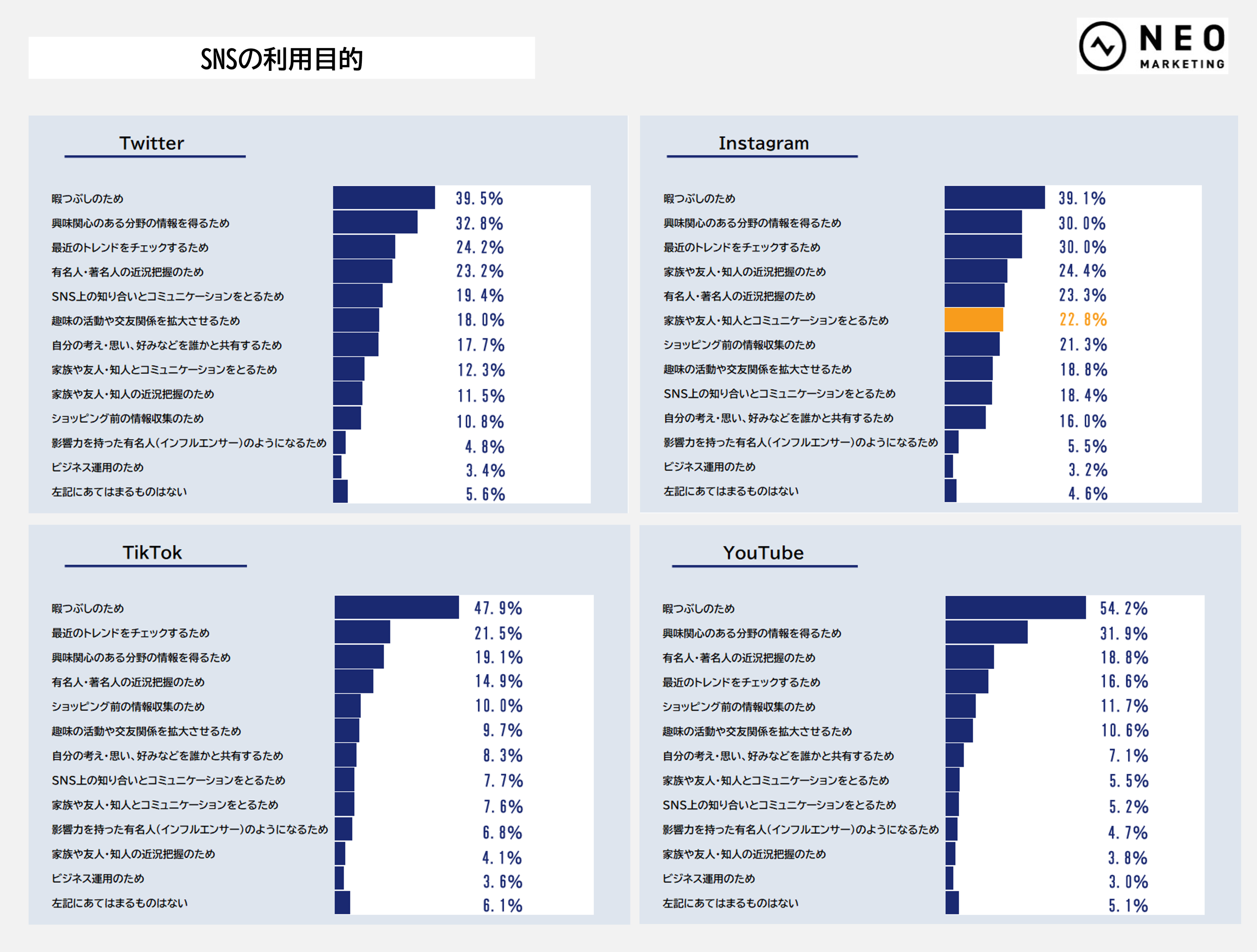Twitter(ツイッター)とInstagram(インスタグラム)の利用目的について、「暇つぶしのため」「興味関心のある分野の情報を得るため」「最近のトレンドをチェックするため」が上位に来ている点が共通しています。しかし一方で、Instagram(インスタグラム)の場合、「家族や友人・知人とコミュニケーションをとるため」の利用に22.8%を獲得している点においてTwitter(ツイッター)と差が生じています。