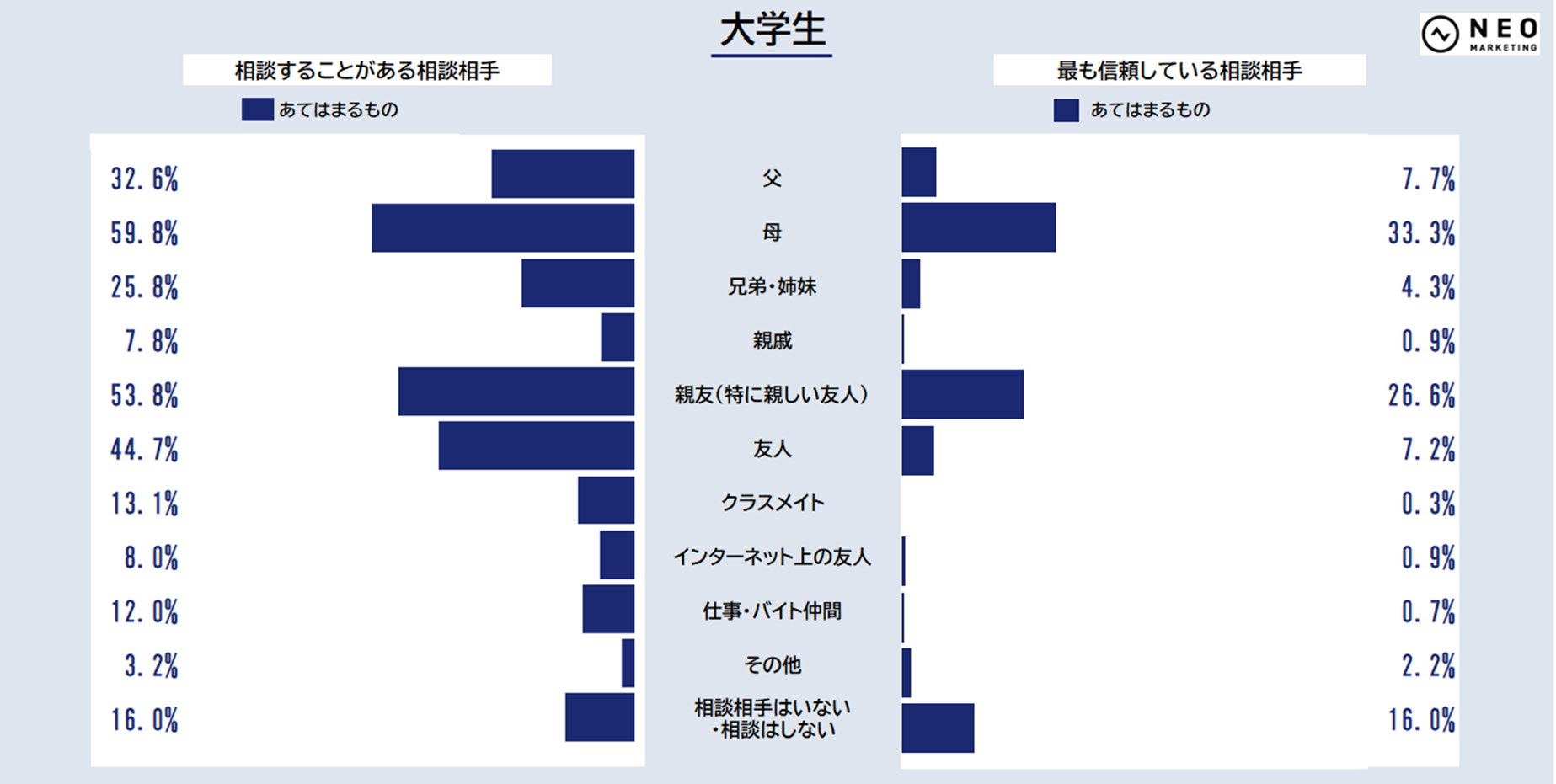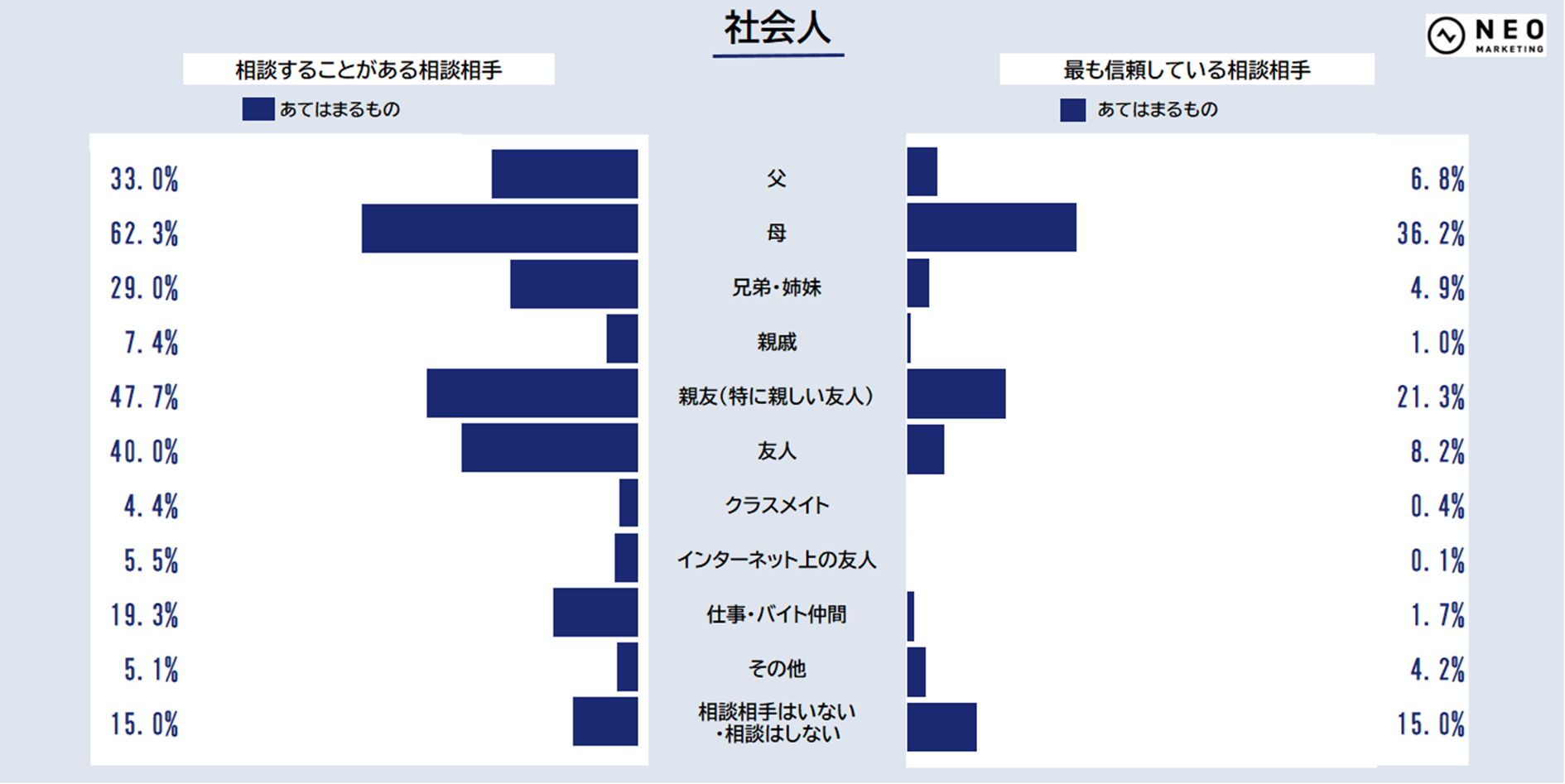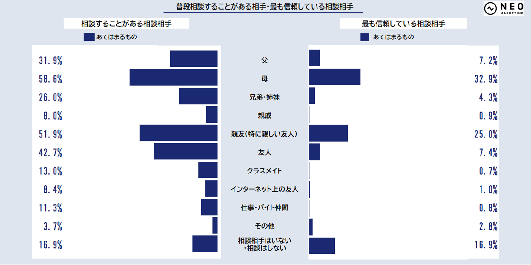 世代別にみると、高校生から社会人になるにつれて母への相談割合は高まる傾向がわかりました。