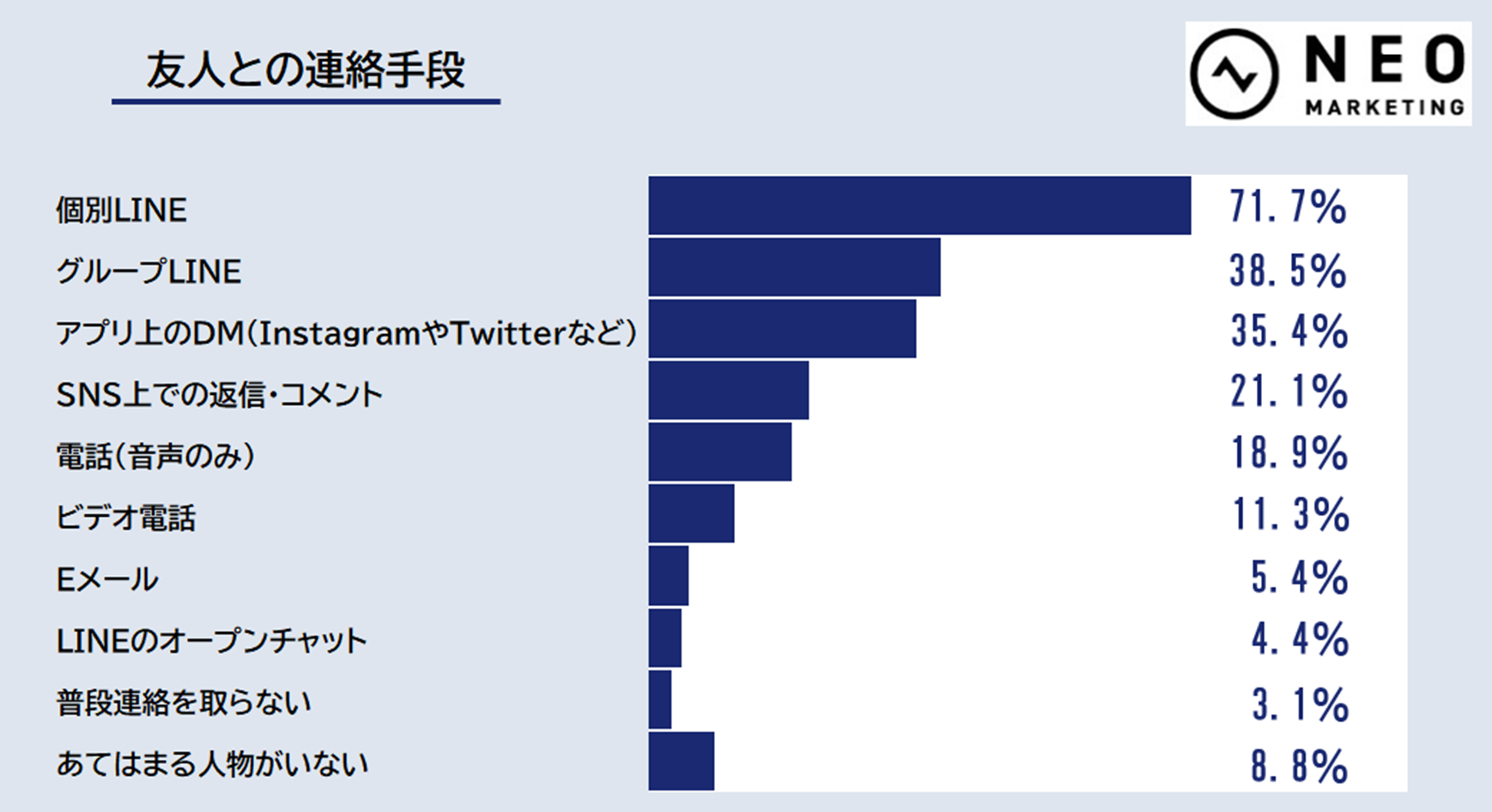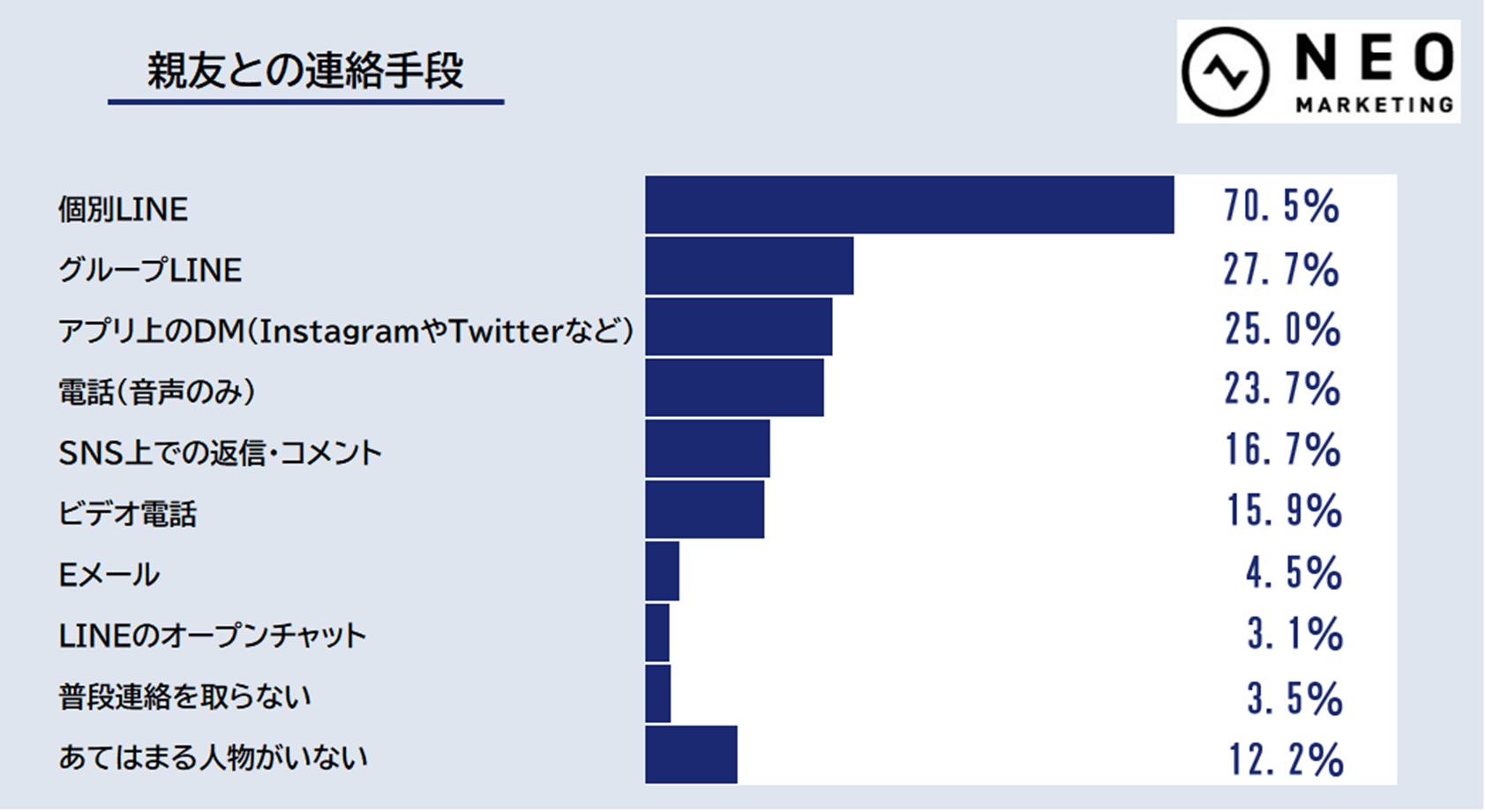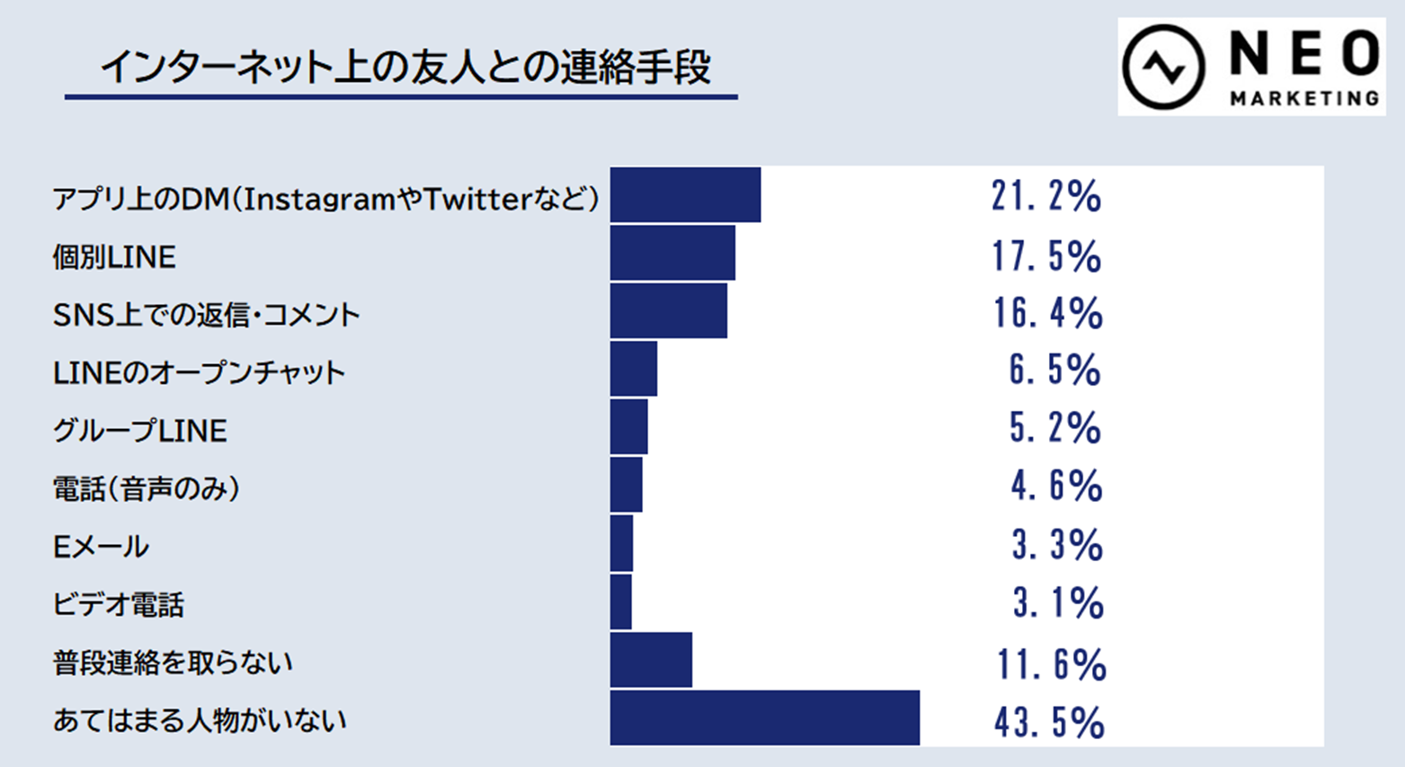 「親友(特に親しい友人)」と「友人」を比較すると、「アプリ上のDM(InstagramやTwitterなど)」について、親友の場合は25.0%であるのに対し友人は35.4%、「SNS上での返信・コメント」について親友の場合は16.7%であるのに対し友人は21.1%を占めています。友人の場合、Instagramのストーリーへの反応等からそのままDM上で会話するケースが多いのかもしれません。
