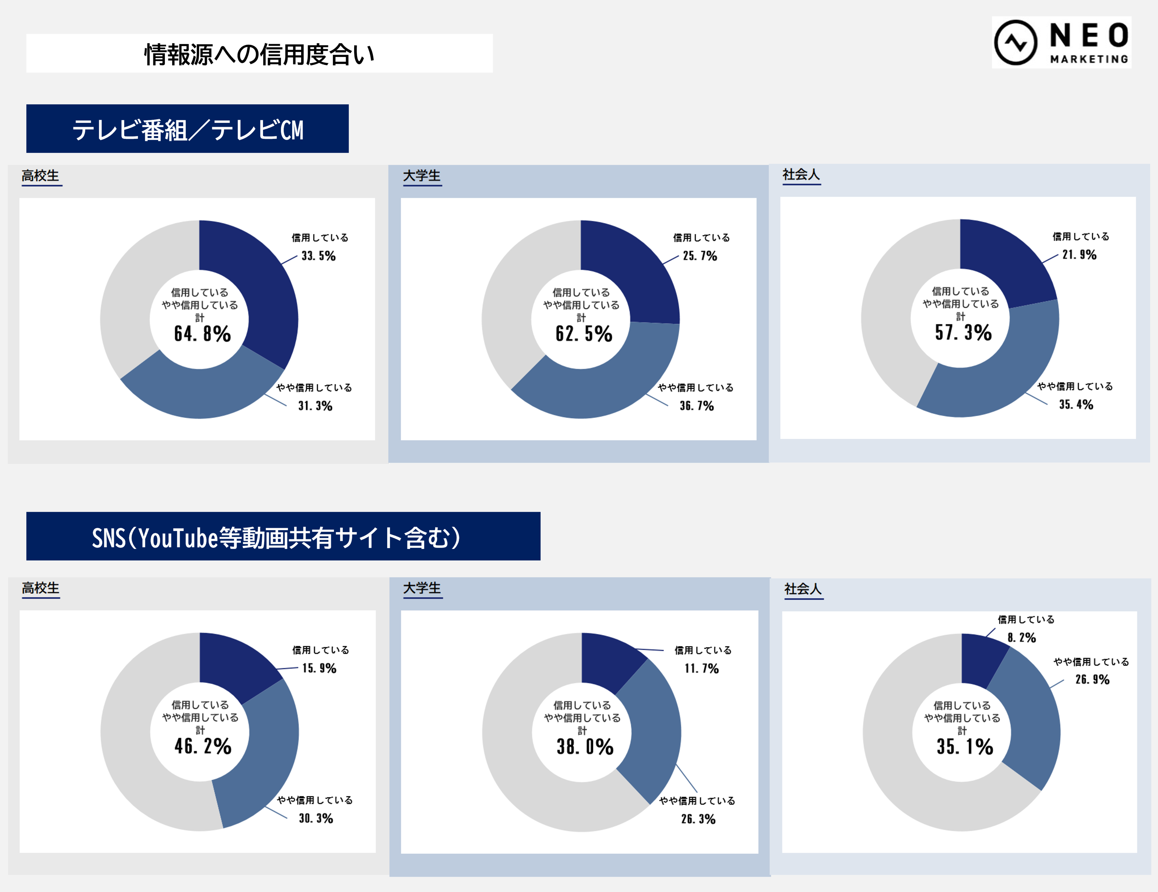 高校生から社会人になるにつれて、それぞれの情報源に対する信用度合いが下がっていくことがわかります。