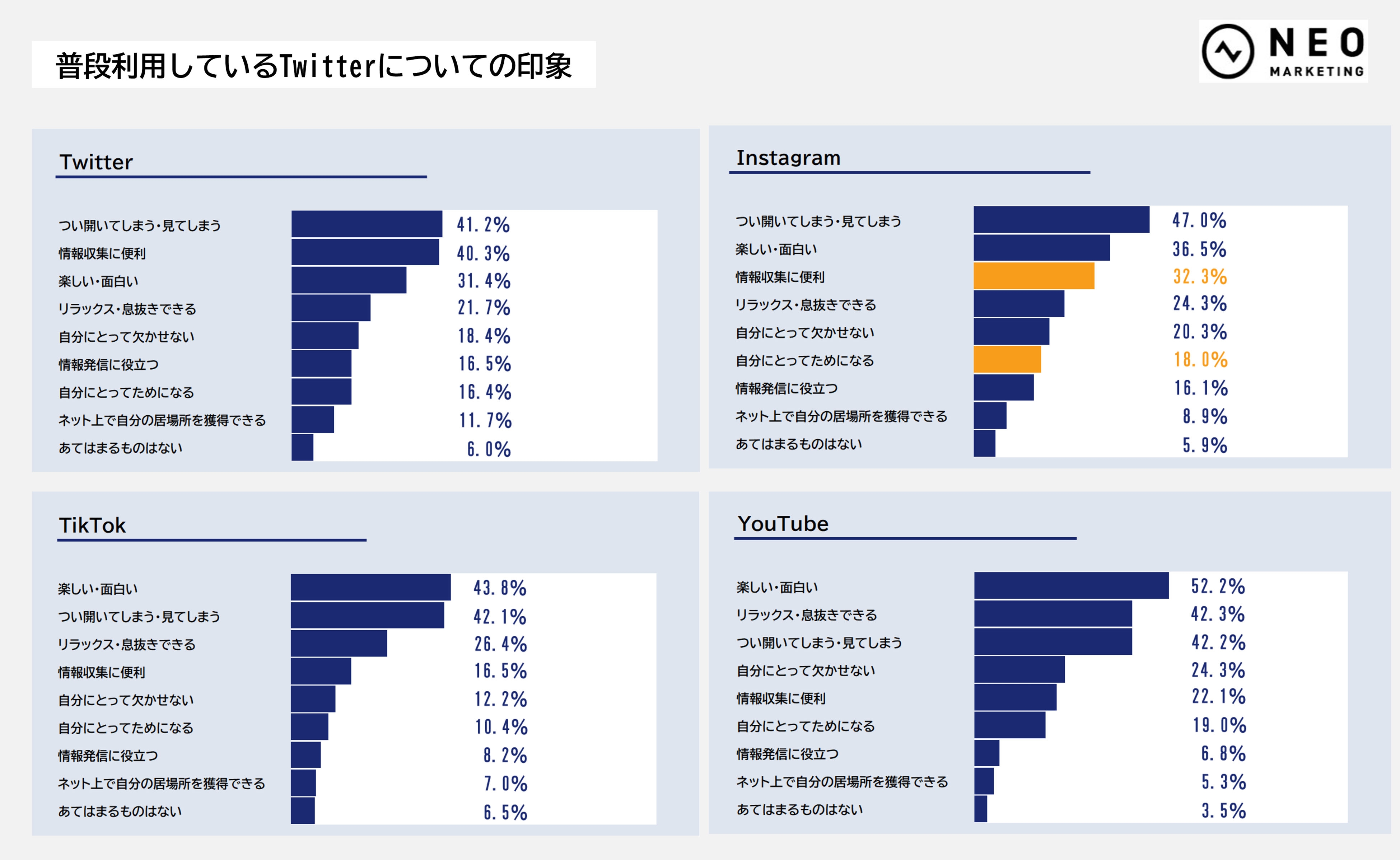 また、Instagram(インスタグラム)について、「情報収集に便利」と回答した割合が30%を超えている点にも注目です。「自分にとってためになる」と回答した割合も18.0%と、Twitter(ツイッター)の16.4%よりも高くなっています。若者のInstagram(インスタグラム)の使い方として、投稿する側の「写真映え」等がフューチャーされがちですが、Z世代にとっては、自分に有益な情報を収集するための検索ツールとしても重要な存在であることがわかります。