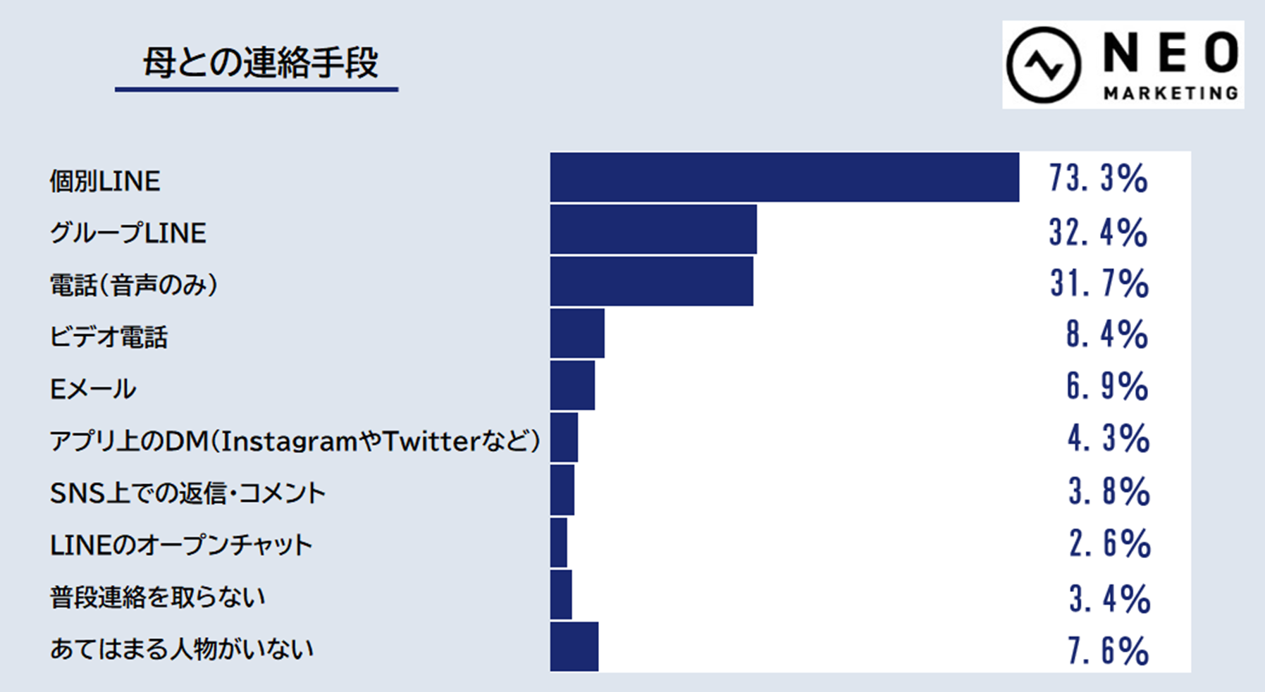 「母」との連絡手段はLINEと電話(音声のみ)で多くを占めました。