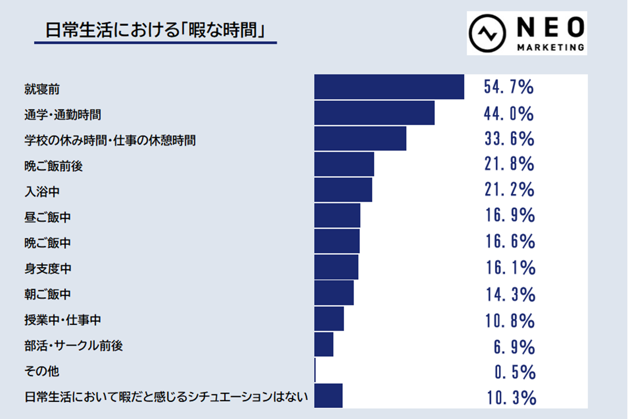 「就寝前」が54.7%を占め、最も「暇な時間」だと感じていることがわかりました。