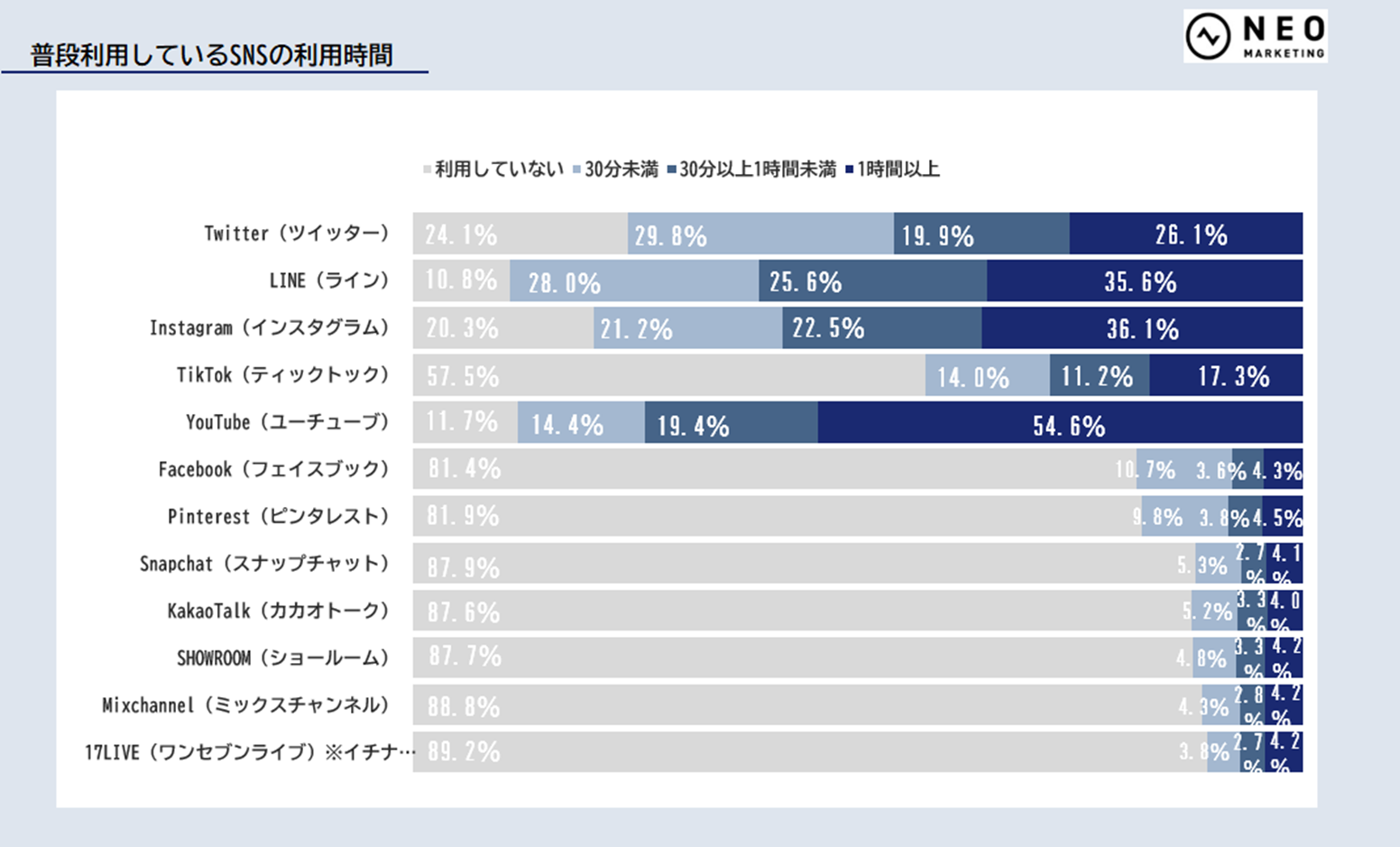これらと比較して「TikTok(ティックトック)」の利用率は下がるものの、1時間以上利用する方が17.3%と5番目に多い結果となりました。