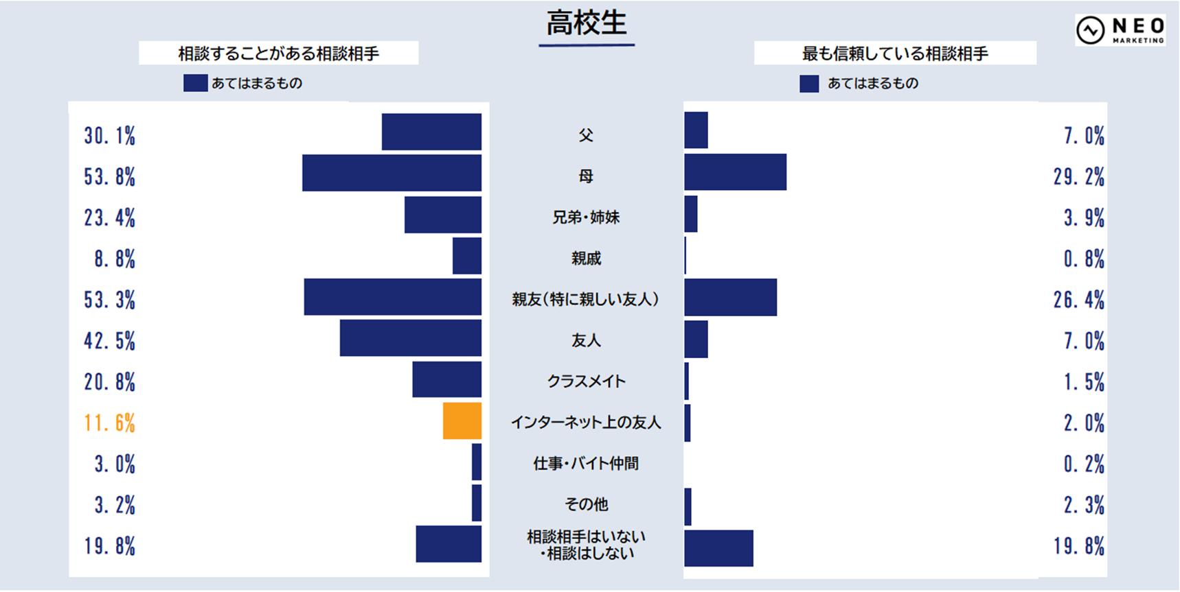 一方で、高校生の相談相手として「インターネット上の友人」が11.6%占めている点にも注目です。