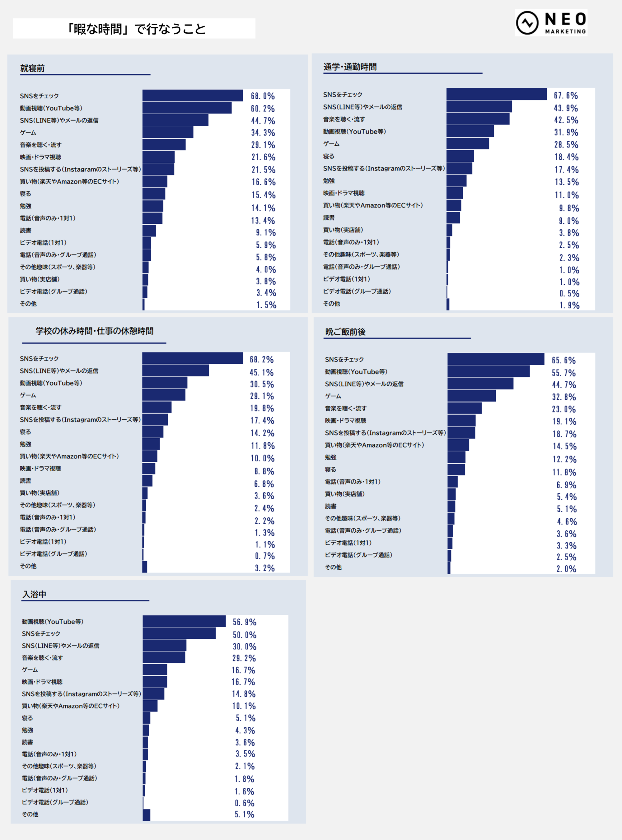 ピックアップした上位5つの「暇な時間」ではすべて、「SNSをチェック」する割合が50%~60%強を占めました。どんなシチュエーションにおいても、手すきの際はSNSのチェックをする傾向にあるようです。