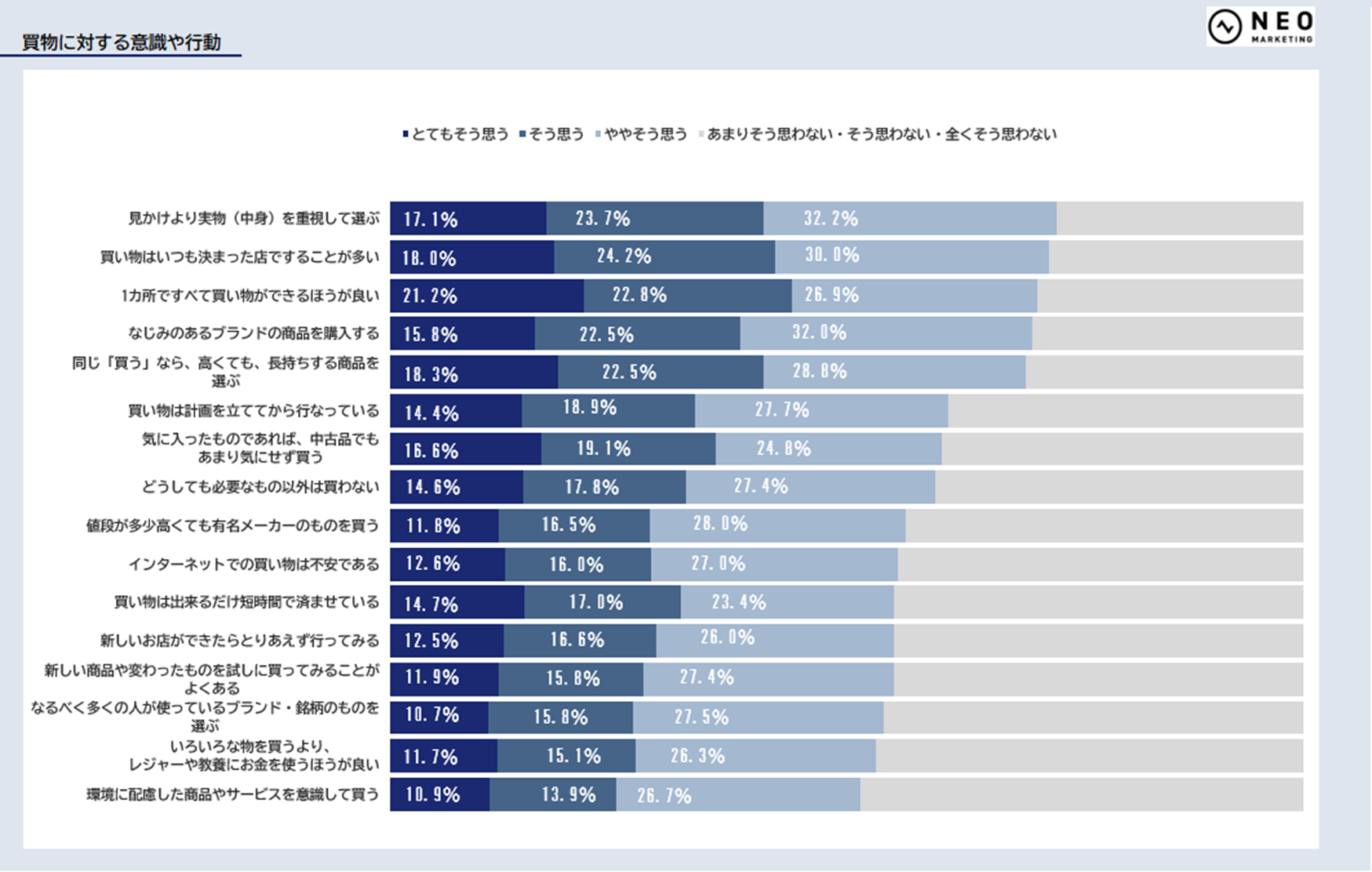 また、同じく「とてもそう思う」「そう思う」のみで40%以上の割合を獲得したのが「1カ所ですべて買い物ができるほうが良い」、「同じ「買う」なら、高くても、長持ちする商品を選ぶ」でした。