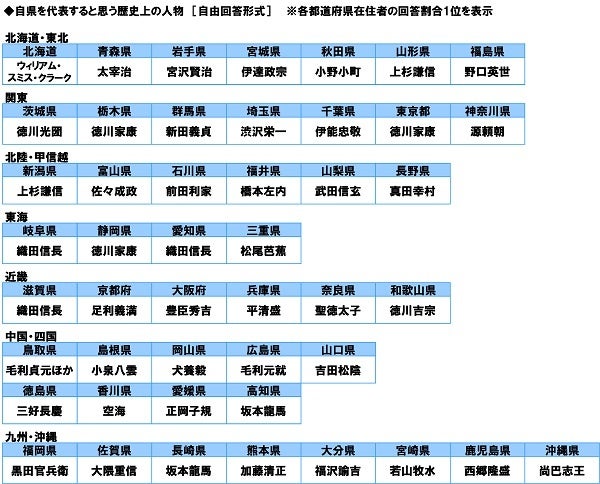◆自県を代表すると思う歴史上の人物 岩手県「宮沢賢治」、宮城県「伊達政宗」、福島県「野口英世」、 茨城県「徳川光圀」、埼玉県「渋沢栄一」、神奈川県「源頼朝」、石川県「前田利家」、山梨県「武田信玄」、 大阪府「豊臣秀吉」、広島県「毛利元就」、山口県「吉田松陰」、熊本県「加藤清正」、鹿児島県「西郷隆盛」 「徳川家康」は栃木県、東京都、静岡県で1位、「織田信長」は岐阜県、愛知県、滋賀県で1位に (図14)