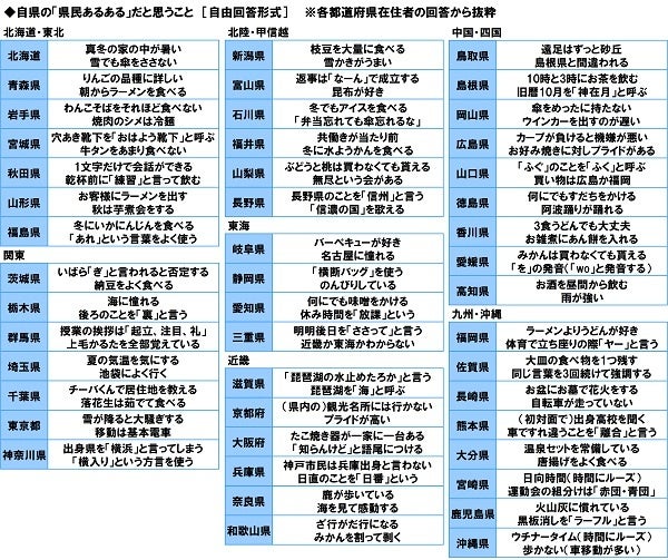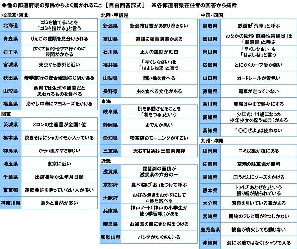 ◆他の都道府県の県民からよく驚かれること 石川県「正月の鏡餅が紅白」、長野県「虫を食べる文化がある」、 静岡県「おでんが黒い」、大阪府「お好み焼きをおかずにしてご飯を食べる」、 秋田県「修学旅行の安否確認のCMがある」、熊本県「ドアに『あとぜき』という張り紙が貼られている」、 群馬県「からっ風がすさまじい」、徳島県「電車が走っていない」、大分県「温泉を引いている家がある」 (図25)