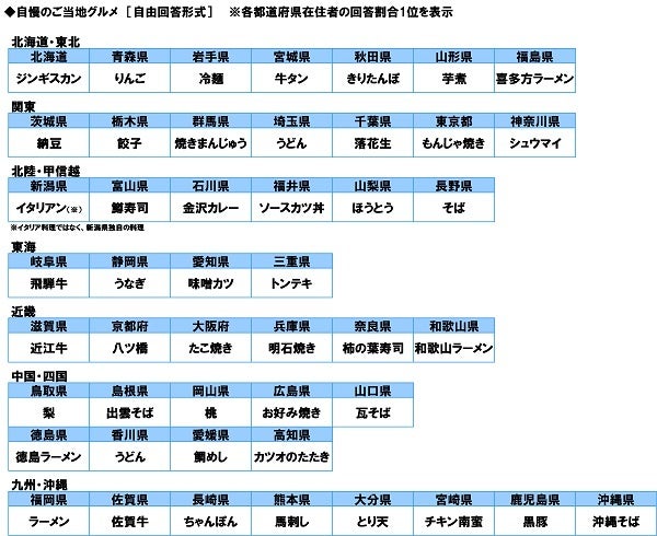 各都道府県の在住者(各都道府県100名)に、自県の自慢のご当地グルメを聞いたところ、北海道では「ジンギスカン」、岩手県では「冷麺」、秋田県では「きりたんぽ」、山形県では「芋煮」、栃木県では「餃子」、群馬県では「焼きまんじゅう」、千葉県では「落花生」、東京都では「もんじゃ焼き」、新潟県では「イタリアン(※)」、福井県では「ソースカツ丼」、山梨県では「ほうとう」、愛知県では「味噌カツ」、三重県では「トンテキ」、滋賀県では「近江牛」、兵庫県では「明石焼き」、奈良県では「柿の葉寿司」、和歌山県では「和歌山ラーメン」、島根県では「出雲そば」、山口県では「瓦そば」、徳島県では「徳島ラーメン」、宮崎県では「チキン南蛮」、沖縄県では「沖縄そば」といった回答が挙げられました。 (図4)