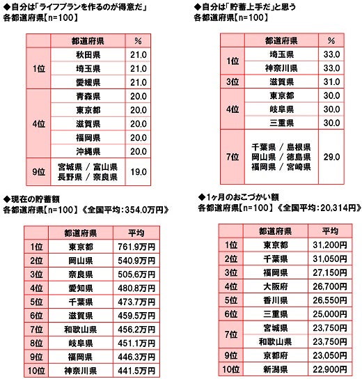 ◆“ライフプラン作りが得意”1位は「秋田県」「埼玉県」「愛媛県」、“貯蓄上手”1位は「埼玉県」「神奈川県」