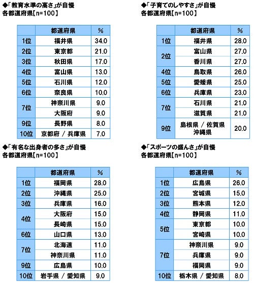 【有名な出身者の多さ自慢】では、1位「福岡県」(28.0%)、2位「沖縄県」(25.0%)、3位「兵庫県」(16.0%)となり、福岡県が2年連続の1位となりました。 (図7) 【スポーツの盛んさ自慢】では、1位「広島県」(26.0%)、2位「宮城県」(15.0%)、3位「熊本県」(12.0%)となり、広島県が2年連続の1位でした。 (図8)
