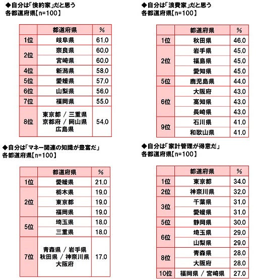 ◆“マネー知識が豊富”1位は「愛媛県」、“家計管理が得意”1位は「東京都」