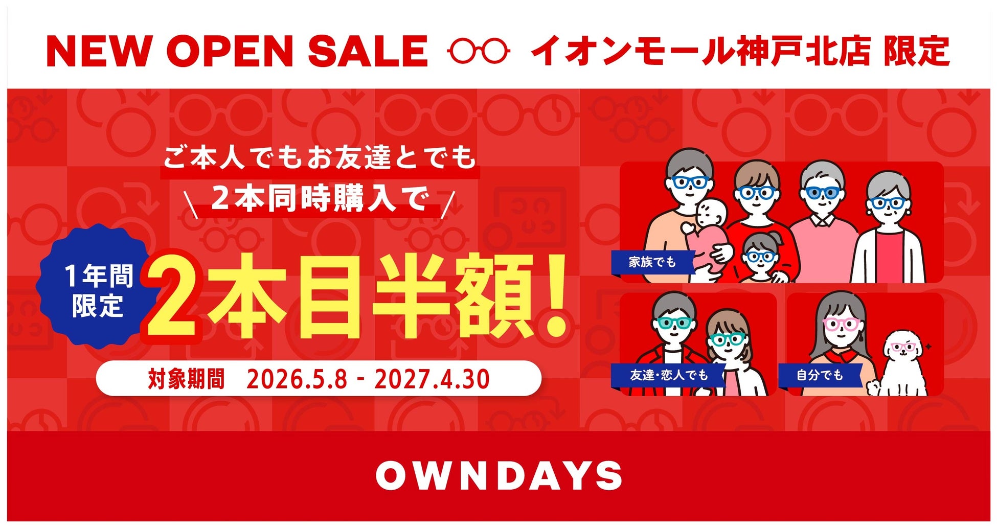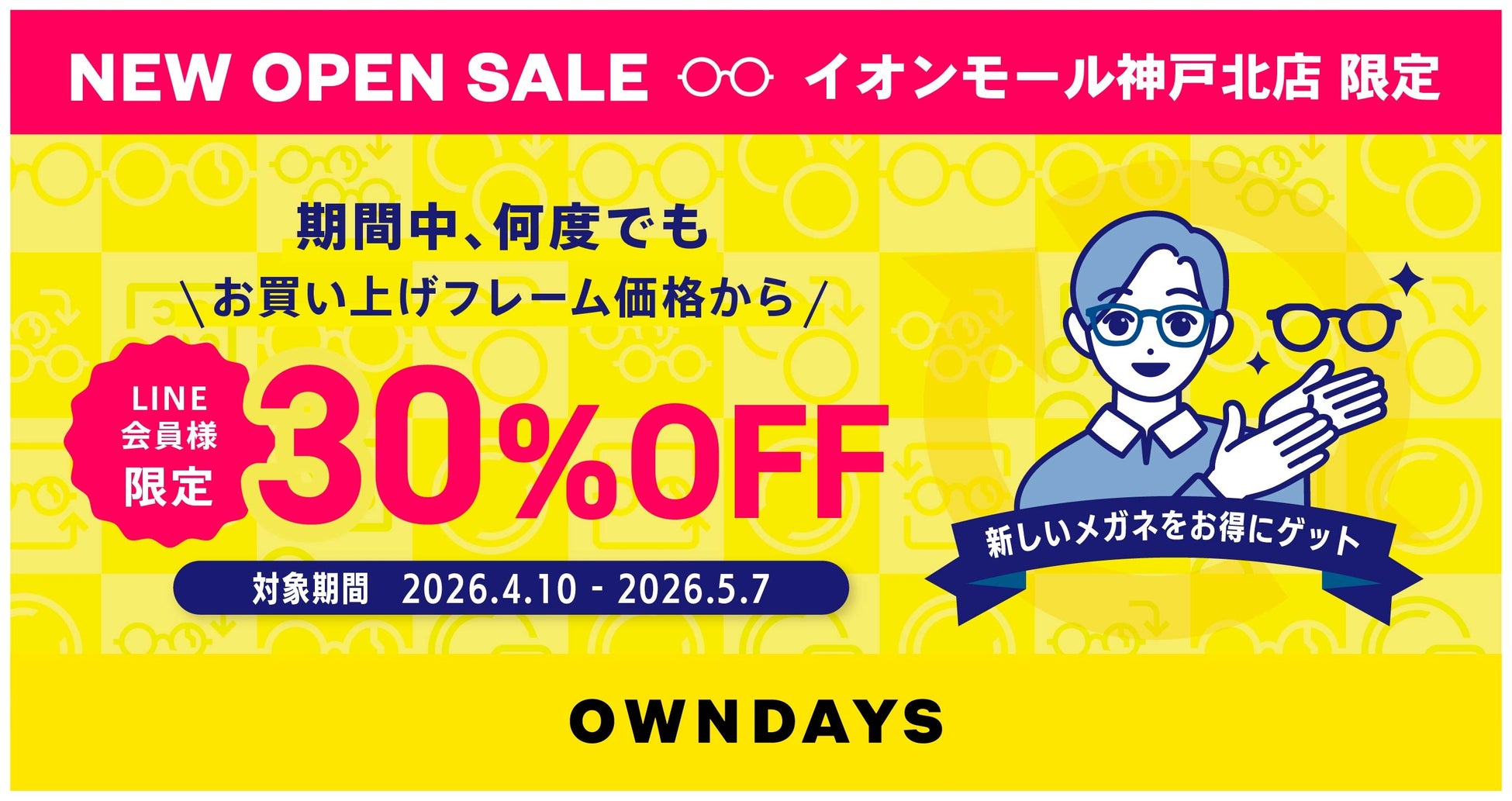 2026年4月10日(金)から5月7日(木)までの期間中、「OWNDAYS イオンモール神戸北店」をご利用いただくお客様を対象に、6,000円(税込)以上フレームが表示価格から30%OFFとなる「NEW OPEN SALE」を実施いたします(※2)。本キャンペーンは、OWNDAYS公式LINEアカウントへのご登録を条件に、期間中、何度でもご利用いただけるお得な内容となっています。この機会にぜひご利用下さい。この機会にぜひご来店いただき、春の新生活に向けたアイウェア選びをお楽しみください。
