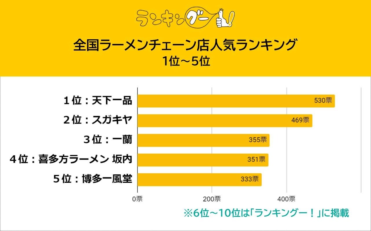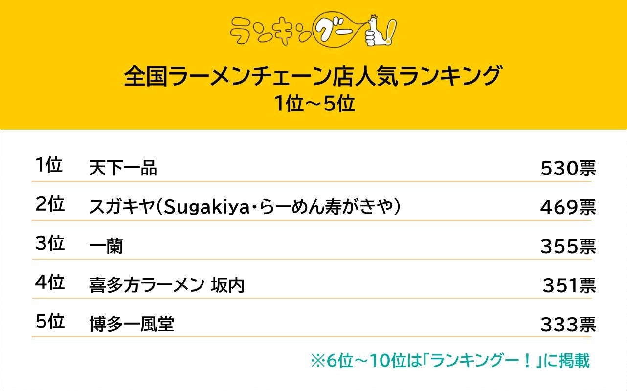 1位の「天下一品」を猛追して2位にランクインしたのは「スガキヤ」。3位以下に100票以上の差をつけ、東海地方を軸に展開するローカルチェーン店として強い存在感を見せました。3位以下10位までは50票以上の差がつくことはなく混戦模様となっています。