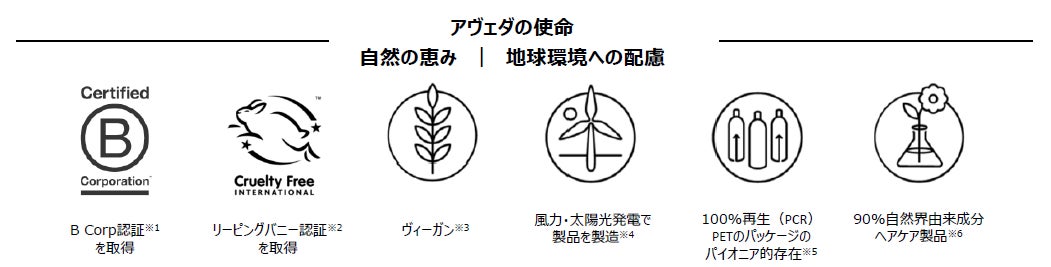 *² リーピングバニー認証とは、クルエルティフリー・インターナショナルによって、製品開発~製造工程で動物実験を行っていないブランドに付与される、国際的に認められている最高水準の認証です。*³ 動物実験も行わず、動物由来成分も使いません。 *⁴ 製品の製造には、(米国の)再生可能エネルギークレジットやカーボンオフセットを通じてアヴェダの太陽電池や風力エネルギーによる電力が供給されています。更に、工場施設において、2023年末までに、ULスキームによるごみ廃棄場のシルバーゼロ ウェイスト認証を取得できるよう取り組んでいます。*⁵ 85%以上のスキンケアおよびヘアスタイリングのPETパッケージとジャー容器は再生(PCR)PETを100%使用しています。 またアヴェダは美容業界において、100%再生(PCR)PETパッケージを採用した初めての化粧品会社です。*⁶ 自然界由来成分とはISO16128の自然由来原料の定義に基づいたもので、成分の由来の大半が植物、非石油系ミネラル、または水であることを意味します。また、90%は、アヴェダヘアケア製品のアヴェダが算出したおおよその値です。