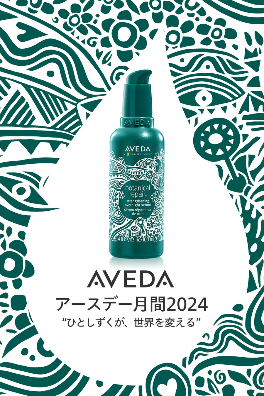 2024年3月24日から9月30日まで(または在庫がなくなるまで)、すべての参加店舗やaveda.com、aveda.caを始めとする各国のウェブサイトで販売されたボタニカル リペア オーバーナイト セラム1本につき20ドル、最大で総額60万ドルをcharity: waterに寄付し、きれいで安全な飲み水を発展途上国の人々に届けます。*