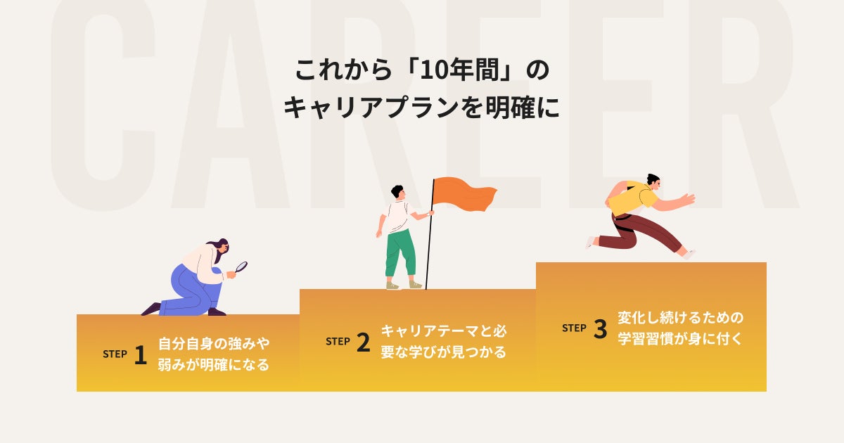 スクーは創業以来12年以上にわたり、100万人以上を超える社会人の学びやそれに伴うキャリア実現を支援してきました。個人がキャリアビジョンを描く上では、いきなり転職や起業に走るのではなく、まずは自分自身と深く向き合いキャリアの棚卸しをすることで納得感のある「次の10年間のキャリアプラン」を明確にすることが近道であると考えます。しかし、個人のキャリアや働き方が多様化する中で、自身のキャリアビジョンを独力で明確に描き、実現に向けて行動を起こすことは容易ではありません。
