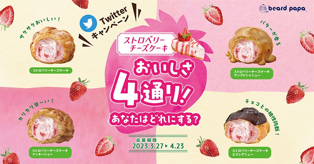 3月27日(月)から4月23日(日)までの期間、「ストロベリーチーズケーキ おいしさ4通り!あなたはどれにする?」と題したTwitterキャンペーンを実施いたします。ビアードパパ公式Twitterをフォローし、お好みのシュー生地との組み合わせを投票(ツイート)いただいた方の中から抽選で10名様に、ビアードパパ特別割引券(500円分)をプレゼント!詳しくはビアードパパ公式Twitterをご確認ください。