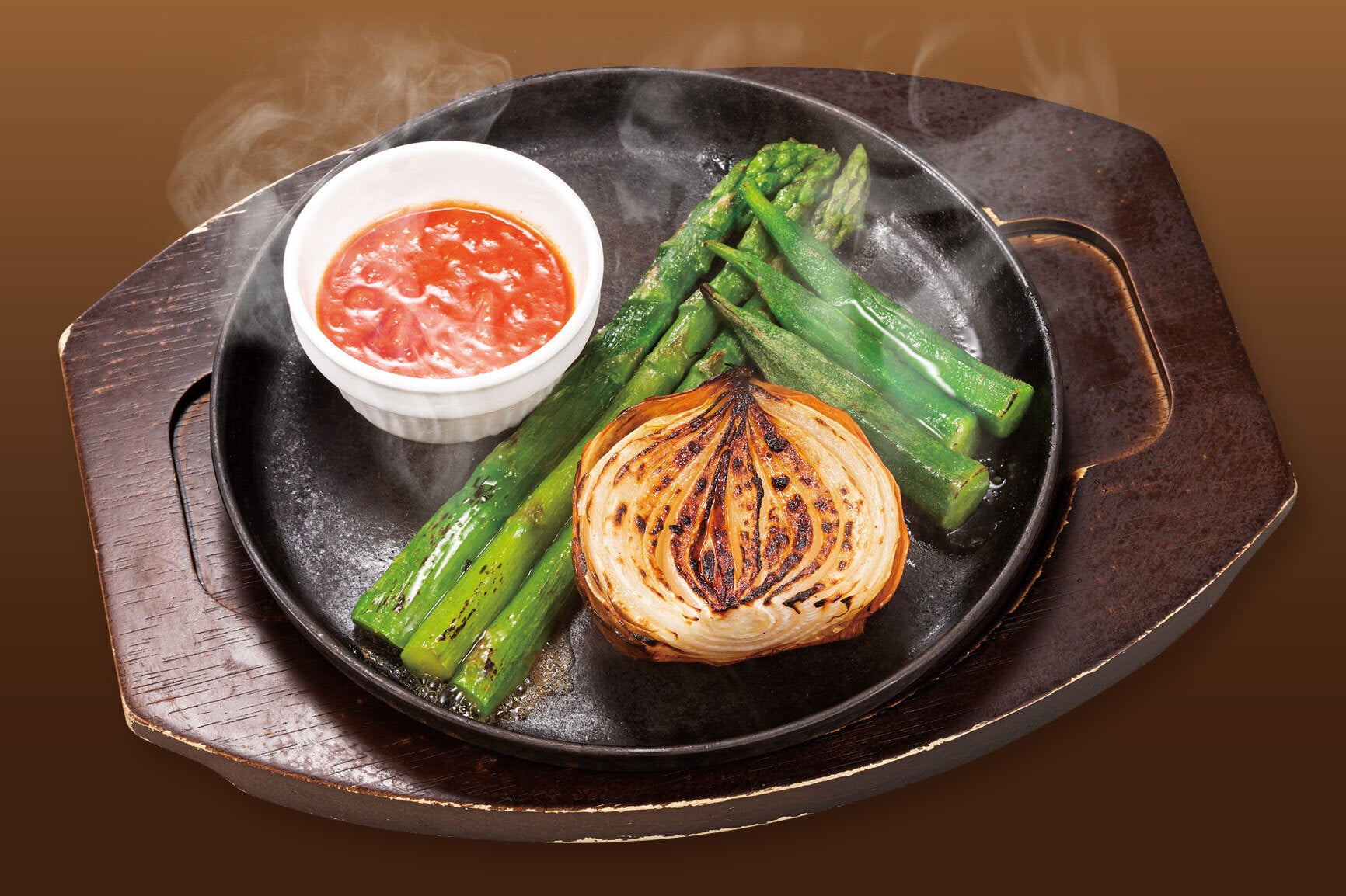 通常ステーキやハンバーグの調理に使用している高温のオーブンで野菜のジューシーさを残しつつ、甘みと旨みを引き出しました。皮付きでグリルすることで適度なジューシーさを残しつつ甘みを引き出した玉ねぎ、香りと歯ざわりが良くねばねばプチプチ食感が楽しいオクラ、ステーキつけ合わせの定番で疲労回復効果のあるアスパラを「ステーキのどん」特製のトマトガーリックソースにつけてお召し上がりください。