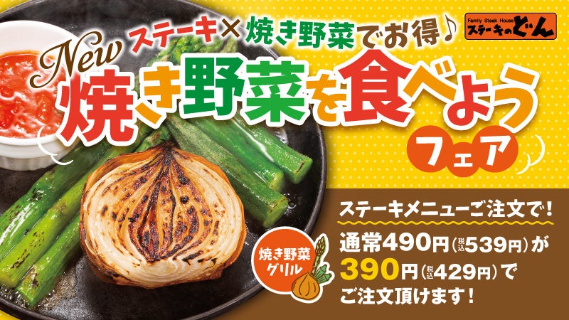 新発売記念として、100g以上の牛肉のステーキとご一緒にご注文いただくことで通常価格から100円引きの390円(税込429円)となる【焼き野菜を食べようフェア】も同時に開始いたします。お肉料理と野菜を健康的にお腹いっぱいお召し上がりください。