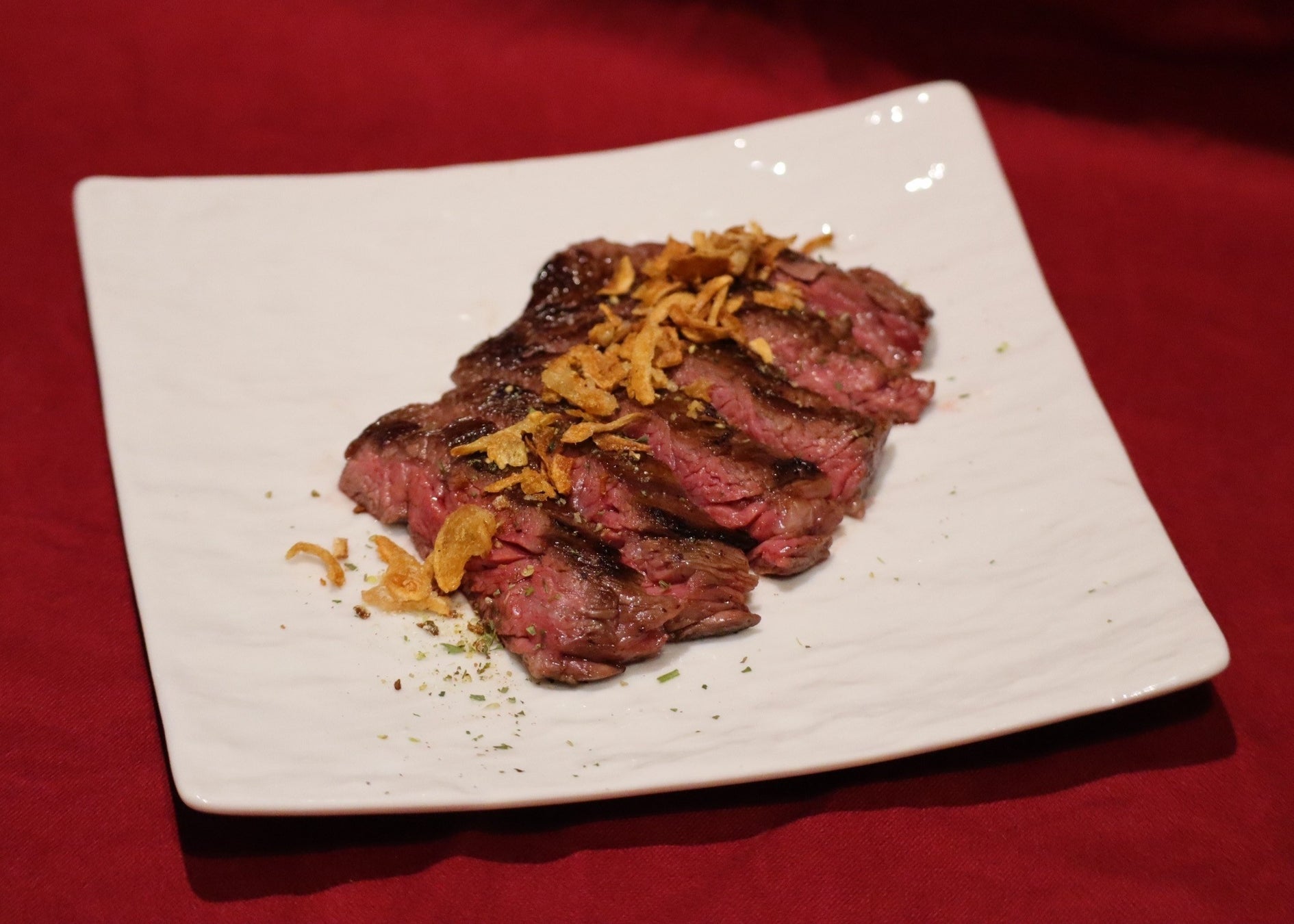 厳選した赤身ステーキに、数種のハーブと香辛料を効かせた特製スパイスをまとわせ、香ばしくミディアムレアに焼き上げました。噛むたびに溢れる赤身ならではの肉汁が口いっぱいに広がり、至福の味わいをお楽しみいただけます。ワインとの相性も抜群です。