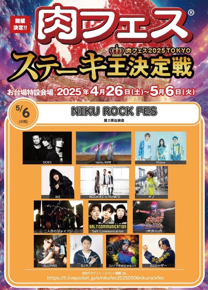今後も、他日程のステージ内容や出演者情報を発表予定です。肉フェスでしか楽しめないステージパフォーマンスとともに、極上の肉料理を堪能できる贅沢な11日間をお届けします!