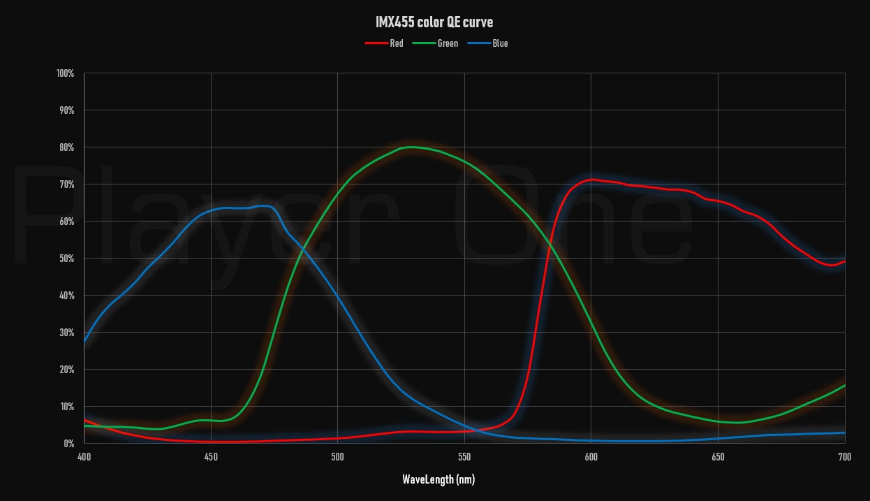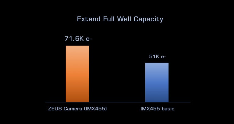 Player Oneの独自のチューニングにより、IMX455のカタログスペックでは51ke-の飽和電荷容量(FullWell)を71.6ke-まで拡張しています。低gainの時は輝度差の大きな対象を撮影しても白飛びしにくく、表現の幅がより広がります。