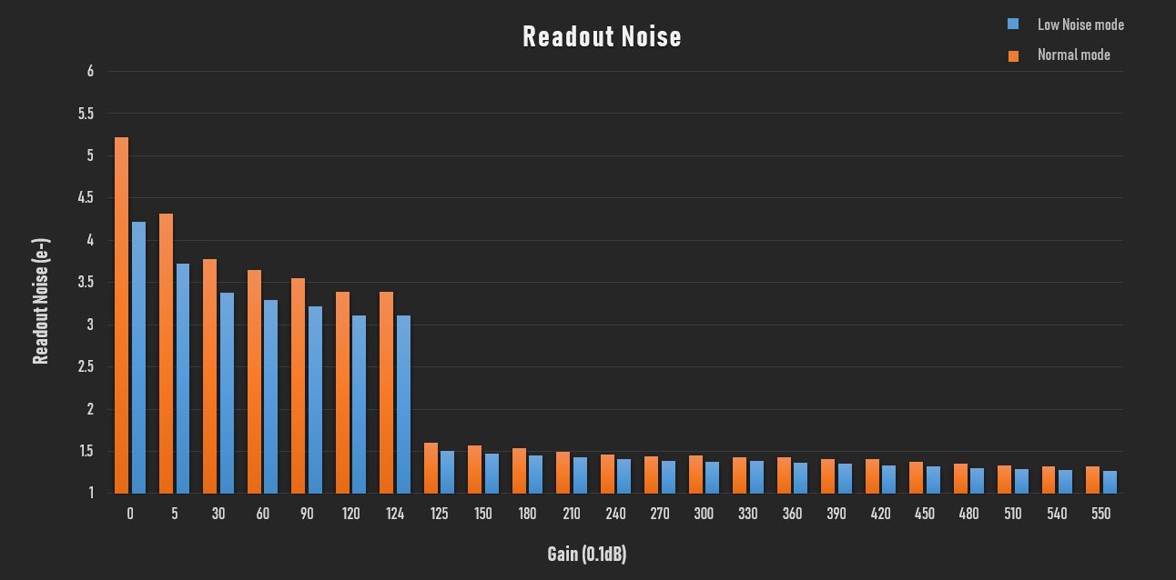 ZEUSシリーズのカメラにはNormalモードとLowNoiseモードの2種類の異なる特性を持った画素読み出しモードが搭載されています。LowNoiseモードでは読み出しノイズが大幅に低減され、長時間露光時により低ノイズな画像を得ることができます。