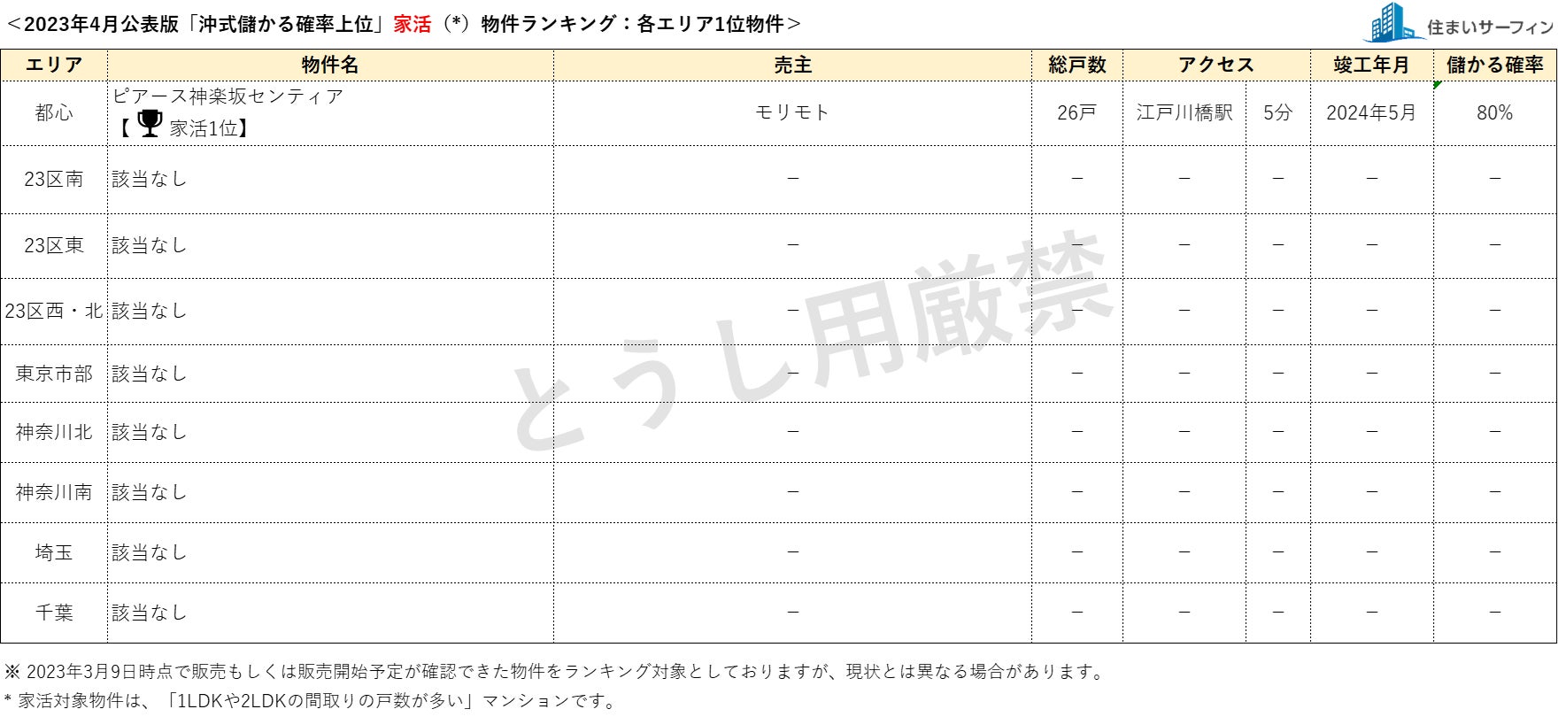 昨今のマンション価格の高騰を受け、購入検討時に資産性を重視する消費者の割合が高まりつつあります。このような社会動向と消費者ニーズをふまえ、「住まいサーフィン」では資産性を重視したマンション選びの支援を目的に、首都圏のマンションを「沖式儲かる確率」の高い順にランキング化し、毎月発表しています。対象物件は、首都圏で販売中および販売予定のマンションで、本リリースでは9エリアにおける“スタンダード(*)”物件と“家活(*)”物件それぞれ1位の物件のみを公表しています。