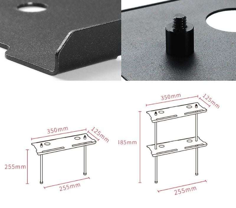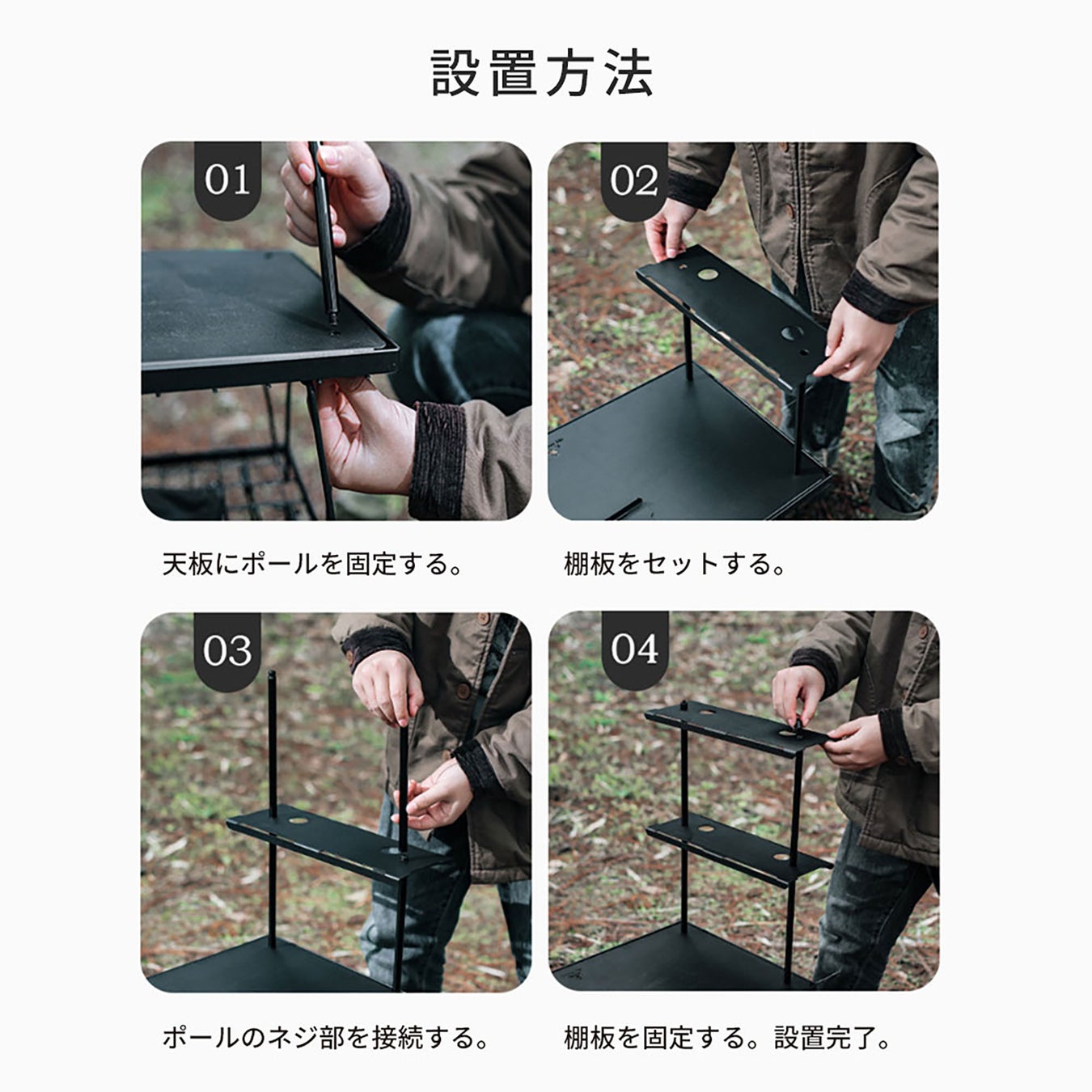 キャンキャンパーのフィールドラック用天板に取り付け可能なシェルフはシンプルな1層タイプと、立った姿勢でも小物の出し入れがしやすい2層タイプがあり、どちらも組み立ては簡単。
