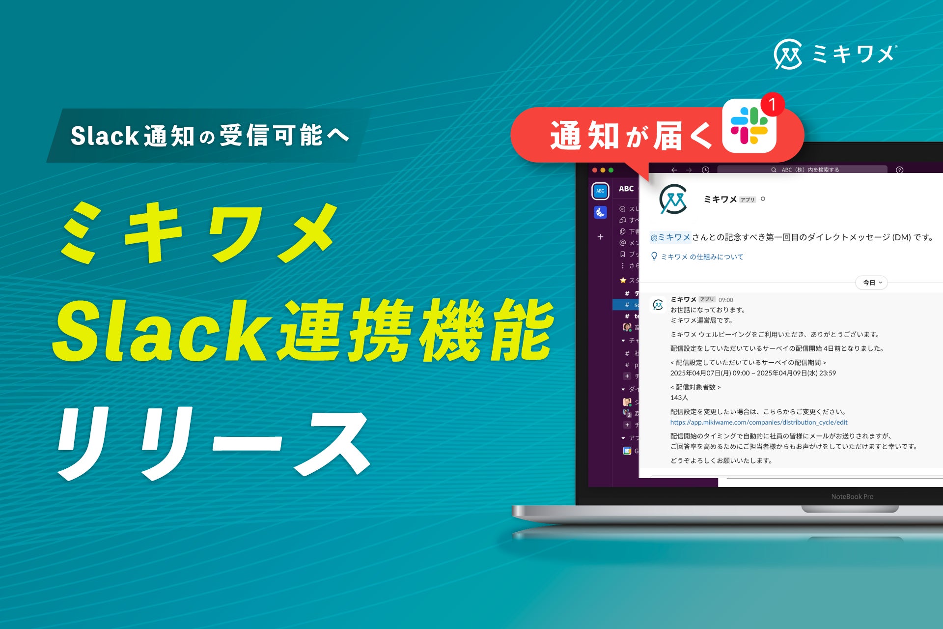 株式会社リーディングマーク(本社:東京都港区、代表取締役社長:飯田 悠司)が提供する、適性検査・ウェルビーイングサーベイ(パルスサーベイ、エンゲージメントサーベイ機能)の「ミキワメ」は、ビジネスコミュニケーションツール「Slack」との連携機能をリリースしたことをお知らせします。