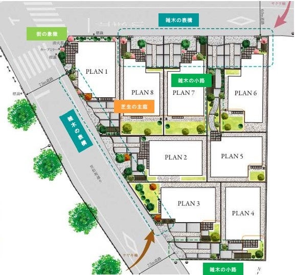 自分の好みの樹木や花を庭に植えるのではなく、永い年月にわたる剪定管理を前提に、在来種を中心に樹種を選定。雑木を植栽した庭にすることで、程よい大きさに育ち、お手入れしやすく、美しい自然樹形が永い期間楽しめる「繋ぎ庭(つなぎにわ)」を計画をしました。 緑豊かな分譲地として、緑地率30%を実現。また、この緑を維持するため、住民の方々と「緑の協定」(3枚目に記載)を結び、緑豊かな住環境を維持していきます。 ※1緑地率=緑被面積/敷地面積(敷地面積に対する緑被面積の割合)