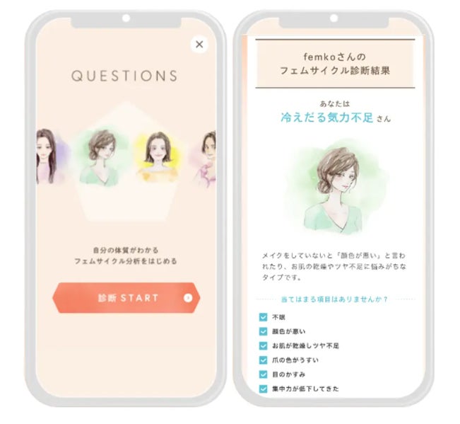 女性ホルモン研究家でもある薬剤師監修により独自開発したヘルスケア理論「フェムサイクルⓇ」を基にしたセルフケアプログラム。年齢や周期でゆれうごく女性の毎日を応援するために生活習慣や体質、心の状態などから診断を行い32万通りの診断結果の中から1人1人にあったアドバイスがもらえます。