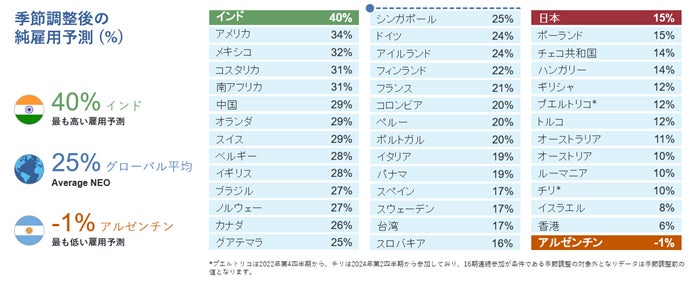 42カ国・地域の純雇用予測:グローバル平均は+25%、日本は+15%