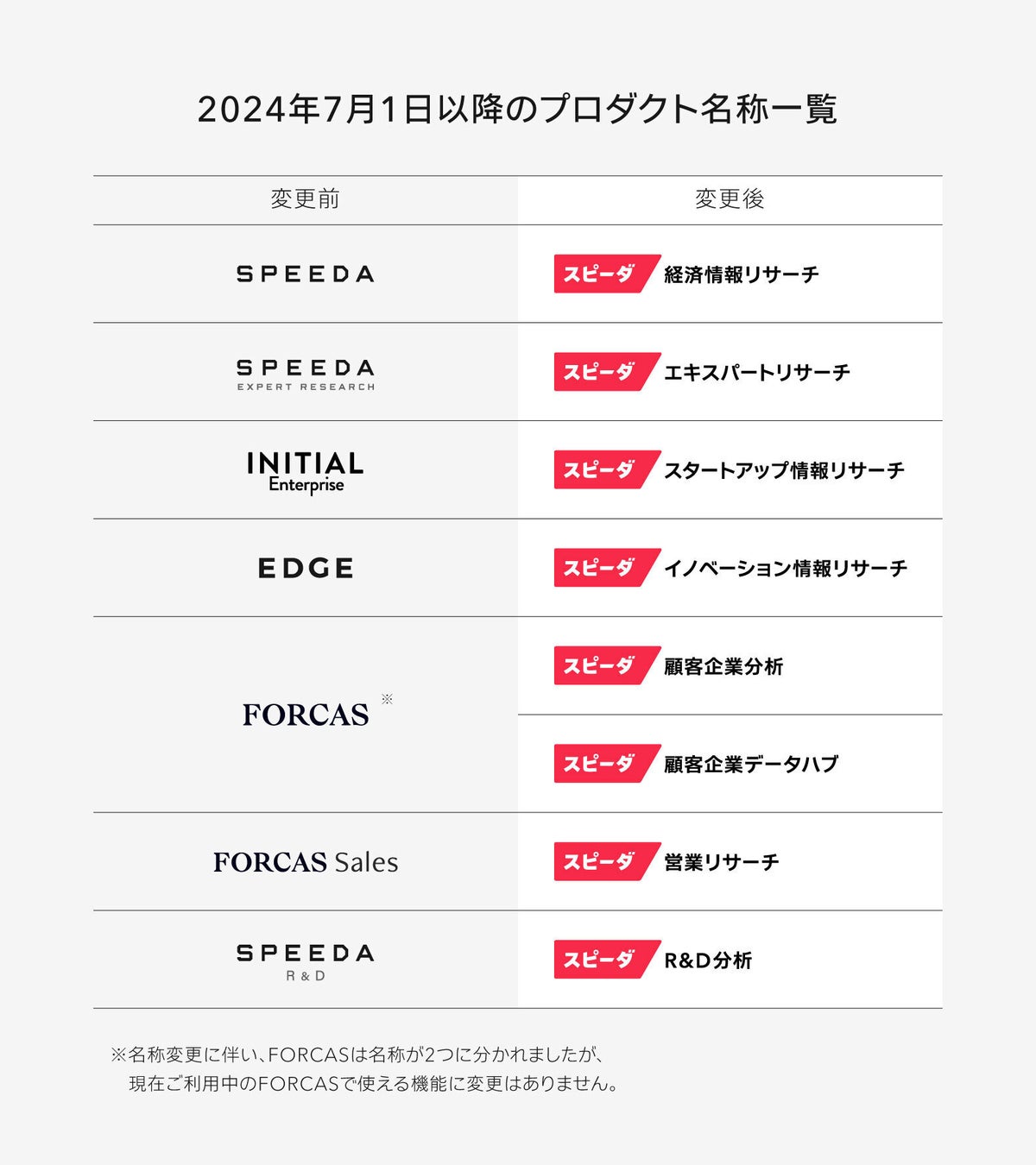 2024年7月1日より、株式会社ユーザベースが展開するSPEEDA・INITIAL・FORCASなどの国内SaaSプロダクト名称を「スピーダ」に統一することをお知らせいたします。