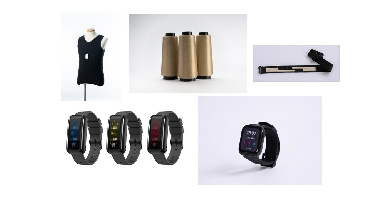 1956年に京都の老舗西陣織帯工場として創業したミツフジは、独自の銀めっき繊維「AGposs®」(写真上中央)を基軸に、ウェアラブルIoT製品の開発・製造・販売を手掛けています。同繊維は抗菌・防臭特性を持つだけでなく、生体データを高精度に取得できる導電性を有し、医療現場や産業界で高く評価されています。注目のスマートウェア「hamon®」シリーズ(同左上)やリストバンドhamon band S(同左下)、スマートウォッチMITSUFUJI 03(同右下)は、熱中症対策やストレス管理といった社会課題の解決に寄与し、国内外で広がりを見せています。