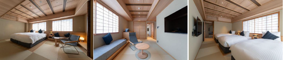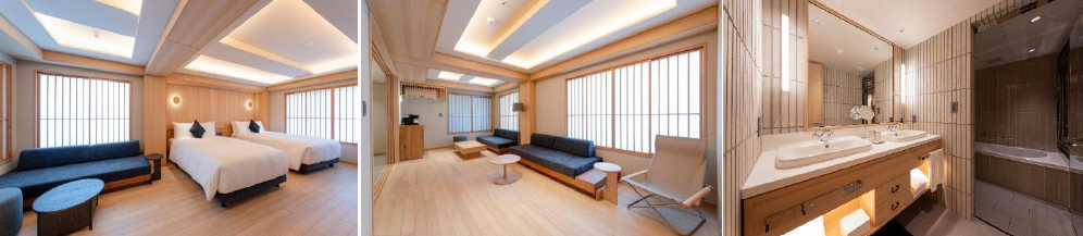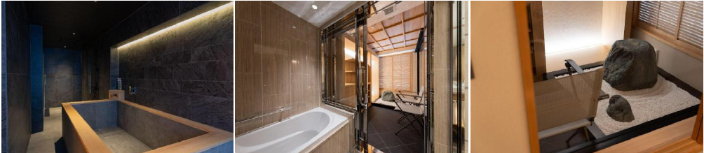 「soyo-ka kyoto sanjo」の客室(全8室)は、特別なバリューアップを実施しました。4室は浴室をアップグレードし、上質な滞在体験を提供できるようにしました。4室は浴室横のスペースに「枯山水」を新設し、京都の美意識を深く体験できる空間になりました。