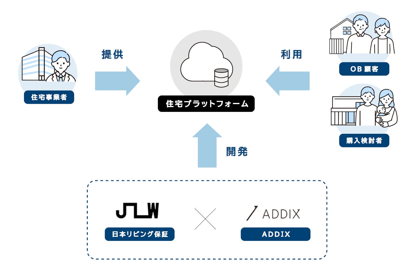 日本リビング保証が保有する住宅業界のデータおよび長年のアフターサービス提供によって培ってきたノウハウに、ADDIXの持つデータ分析手法やクリエイティブ機能を組み合わせることで、新規見込み顧客及び既存住宅オーナー様と住宅事業者様双方を日常的かつ継続的につなぐプラットフォームの創出を目指します。