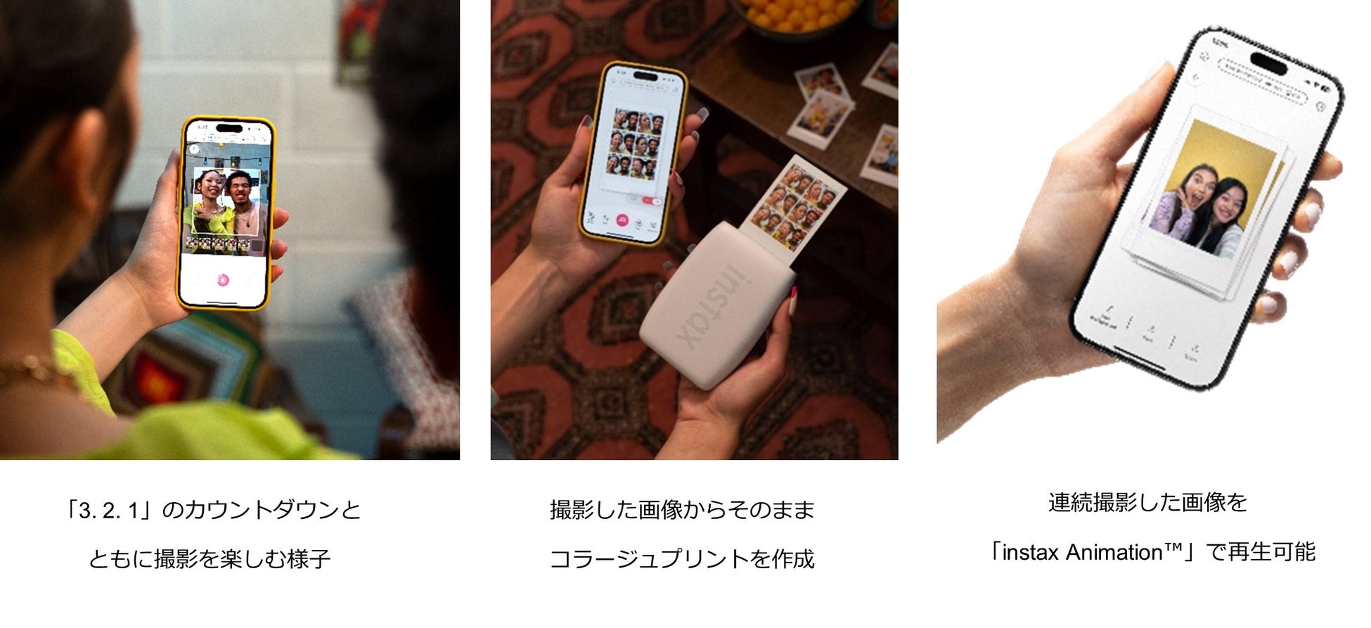 ・専用アプリで連続撮影した画像をすぐにコラージュプリントにできる機能。アプリ画面上に表示される「3.2.1」のカウントダウンに合わせ、最大6枚まで撮影します。複数人でポーズや表情を変えながら、フォトブースで連続撮影を楽しむ感覚でコラージュプリントを作成し、楽しい瞬間を形に残せます。