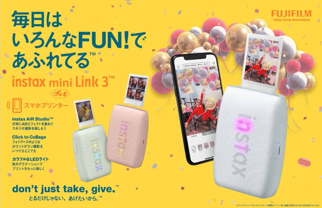 「Link 3」はスマホ内の写真を簡単にプリントできることはもちろん、新機能「instax AiR Studio™︎」では奥行きのあるARエフェクトでその場を彩り、「Click to Collage」では手軽にフォトブースのような撮影体験ができる、進化した遊べるスマホプリンターです。2人で撮るセルフィーから大勢で盛り上がる撮影シーンまで、楽しい時間で埋め尽くして欲しいという想いを「毎日はいろんなFUN!であふれてる™(bring fun to life™)」というメッセージに込めました。オンライン・ソーシャルメディア・店頭などで「Link 3」の魅力を多くの方々に伝えていきます。