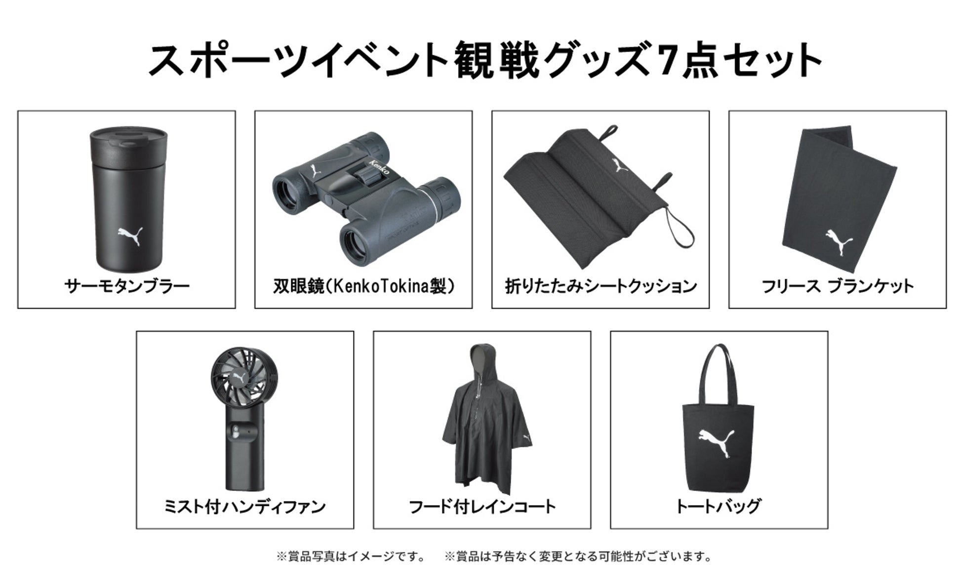 賞 品:サーモタンブラー、双眼鏡、折りたたみシートクッション、フリース ブランケット、ミスト付きハンディファン、フード付レインコート、トートバッグの7点セット