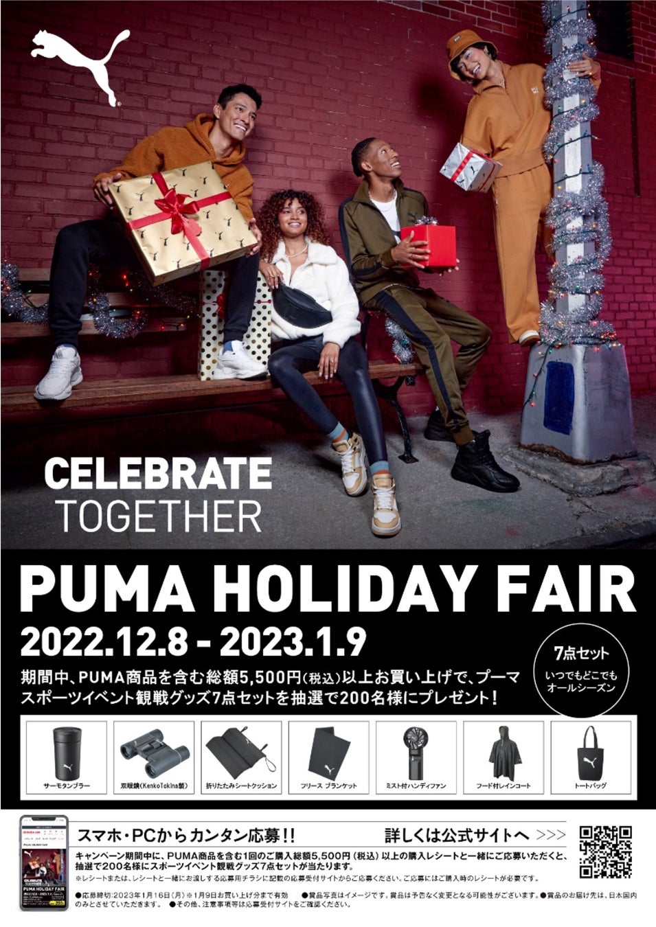 豪華グッズが抽選で200名様に当たる「PUMA HOLIDAY FAIR」12月8日(木)より、全国のシュープラザ、東京靴流通センター他全店舗と、公式オンラインショップ「kutsu.com」で開催。