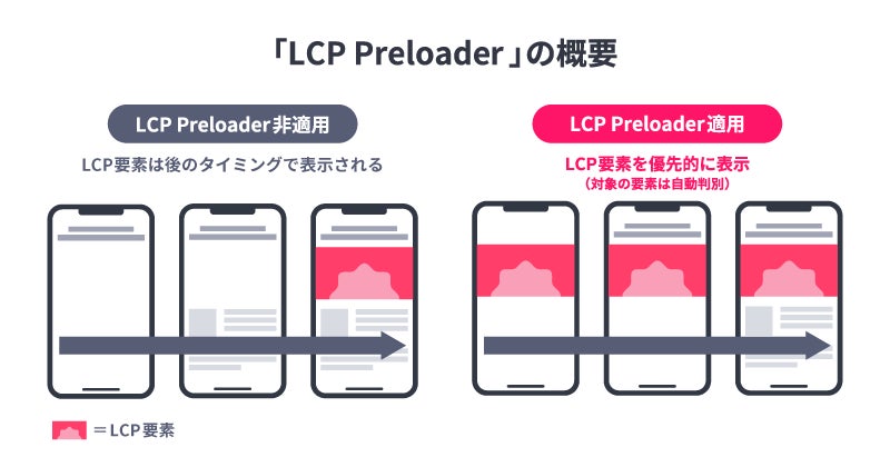 「LCP Preloader」は、ページランディング時にLCP(Largest Contentful Paint)要素を自動で特定し、他の要素よりも優先して表示させる機能です。これにより、LCPに関する指標の改善だけでなく、ユーザーが視覚的に感じる表示速度の向上が期待できます。