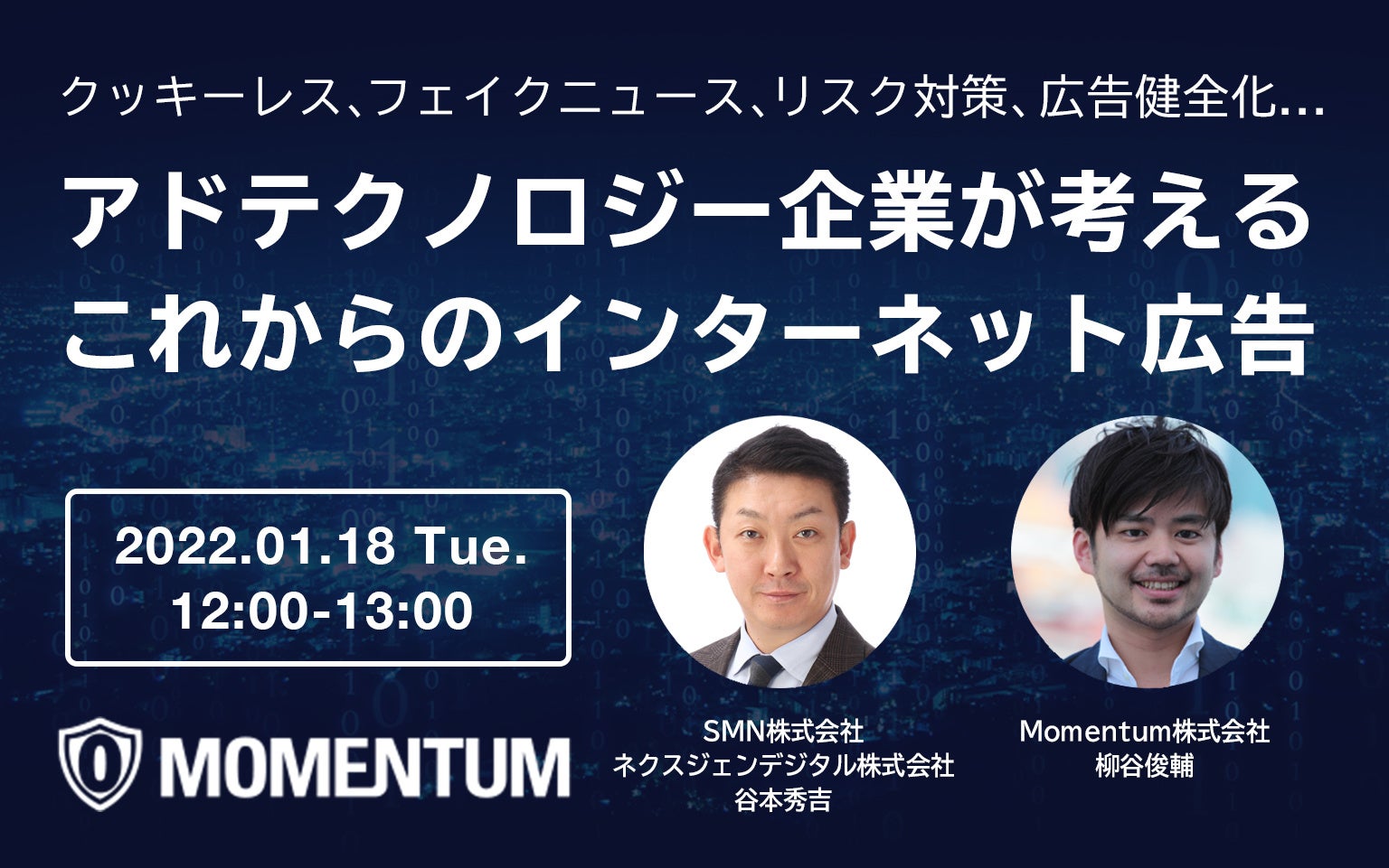 SMN株式会社(本社:東京都品川区、代表取締役社長:井宮 大輔、以下SMN)は、Momentum株式会社(本社:東京都港区、代表取締役社長:瀬戸 亮、以下Momentum)と共同で、インターネット広告に携わる広告主、広告代理店の担当者を対象としたウェビナー「アドテクノロジー企業が考えるこれからのインターネット広告」を、2022年1月18日(火)に開催します。