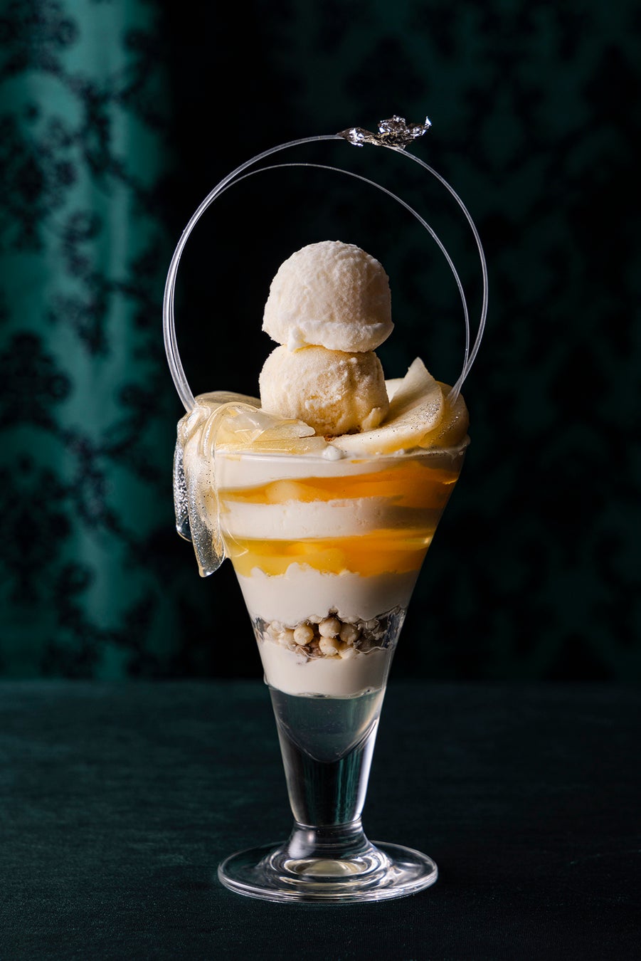 ジューシーで香り高いラ・フランスをたっぷり使い、そのみずみずしさと芳醇な香りを存分に楽しめます。杏仁アイスクリームの優しい甘さと、ホワイトチョコのクリーミーさが絶妙にマッチし、白ワインスパイスゼリーや洋梨のコンポートがフルーティーさをさらに引き立てます。スパイシーで贅沢な味わいと冬の訪れを感じさせるホワイトカラーのデザインで、気品ある仕上がりのラグジュアリーなパフェをご堪能ください。