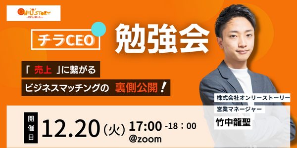 審査制・決裁者マッチングプラットフォーム「ONLY STORY」「チラCEO」(サービスサイト:https://onlystory.co.jp/service/ )を運営する株式会社オンリーストーリー(代表取締役:平野哲也、本社:東京都渋谷区)は、12月20日17時に「売上」につながるビジネスマッチングサービス『チラCEO』説明会をオンライン開催します。