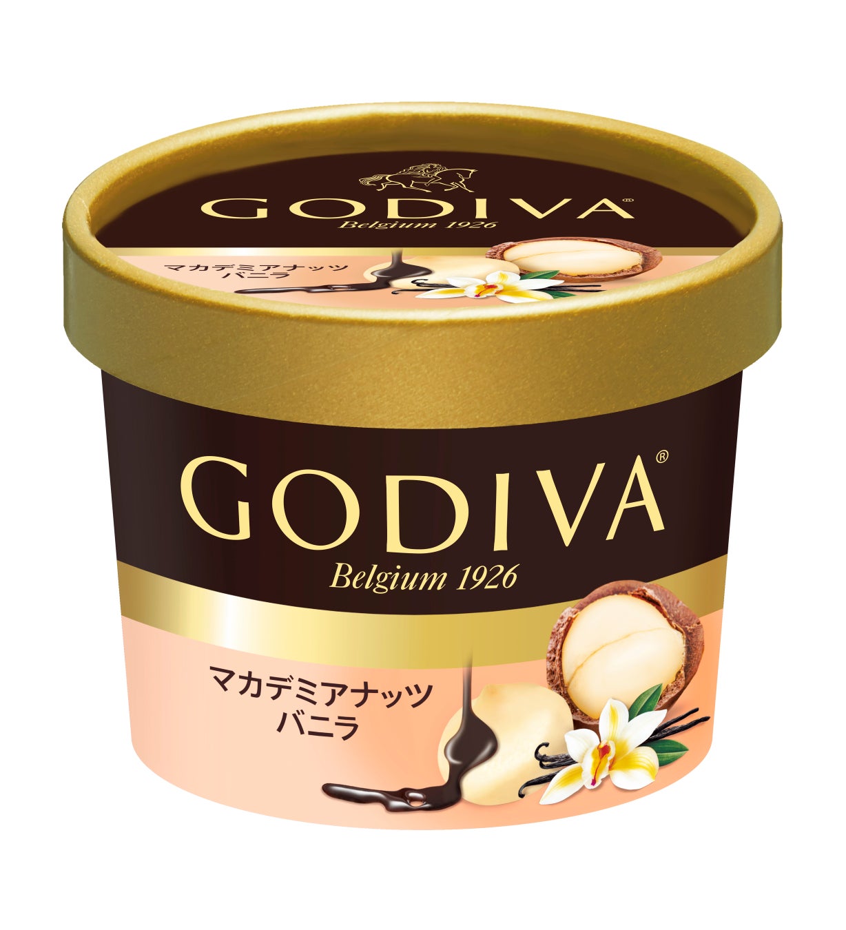 香ばしいマカデミアナッツと、マカデミアナッツに合う濃厚バニラアイス、チョコレートソースが絡み合う芳醇なアイスクリームゴディバ カップアイス「マカデミアナッツバニラ」