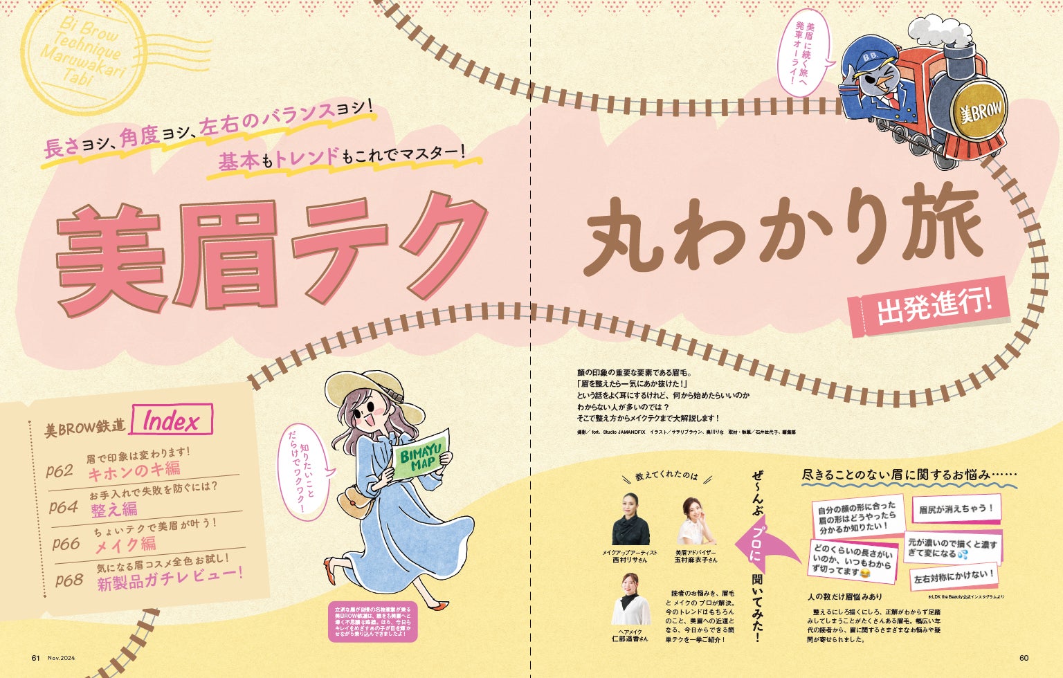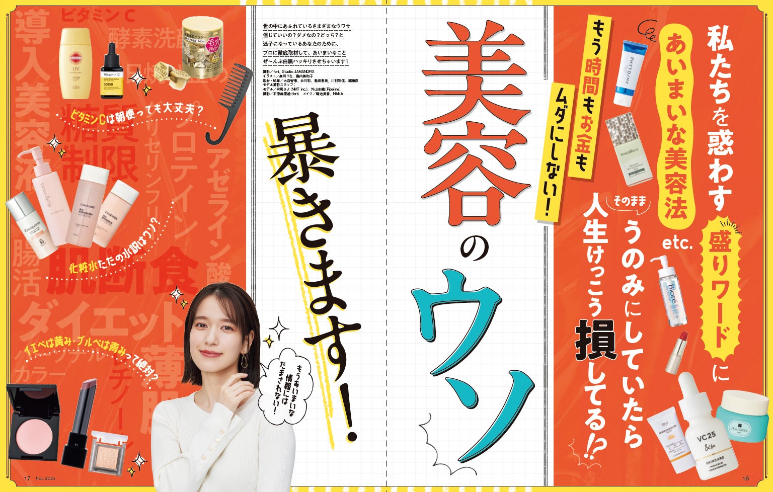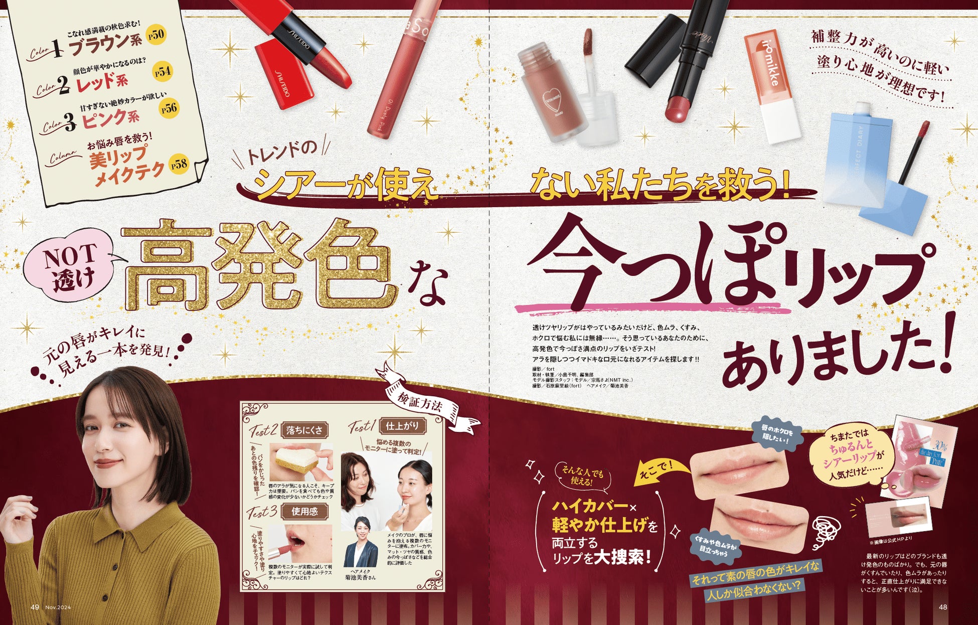 11月号は、ちまたにあふれる「美容のウソ」の正体を大暴露!知ってると知らないとでは大違いな、あいまいワードや盛りすぎワードの真実は要チェックです。他にも、2024秋新作のアイシャドウを徹底検証。また、高発色リップや美眉テク、正しい角質ケアアイテムと、今知りたい美容情報をたっぷりとご紹介します。