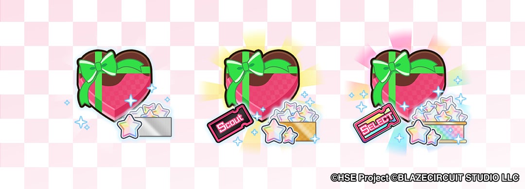 2月13日(木)よりバレンタインにちなんだ、お得な「バレンタインBOX」各種が販売中です。バレンタインBOXを購入すると、スター(無償)、「★3確定スカウトチケット」や、ラインナップの★3キャラクターから好きなキャラクターを選べる「セレクトスカウトチケット」がおまけについてくるアイテムセットとなっています!ぜひ詳細をゲーム内でご確認ください!